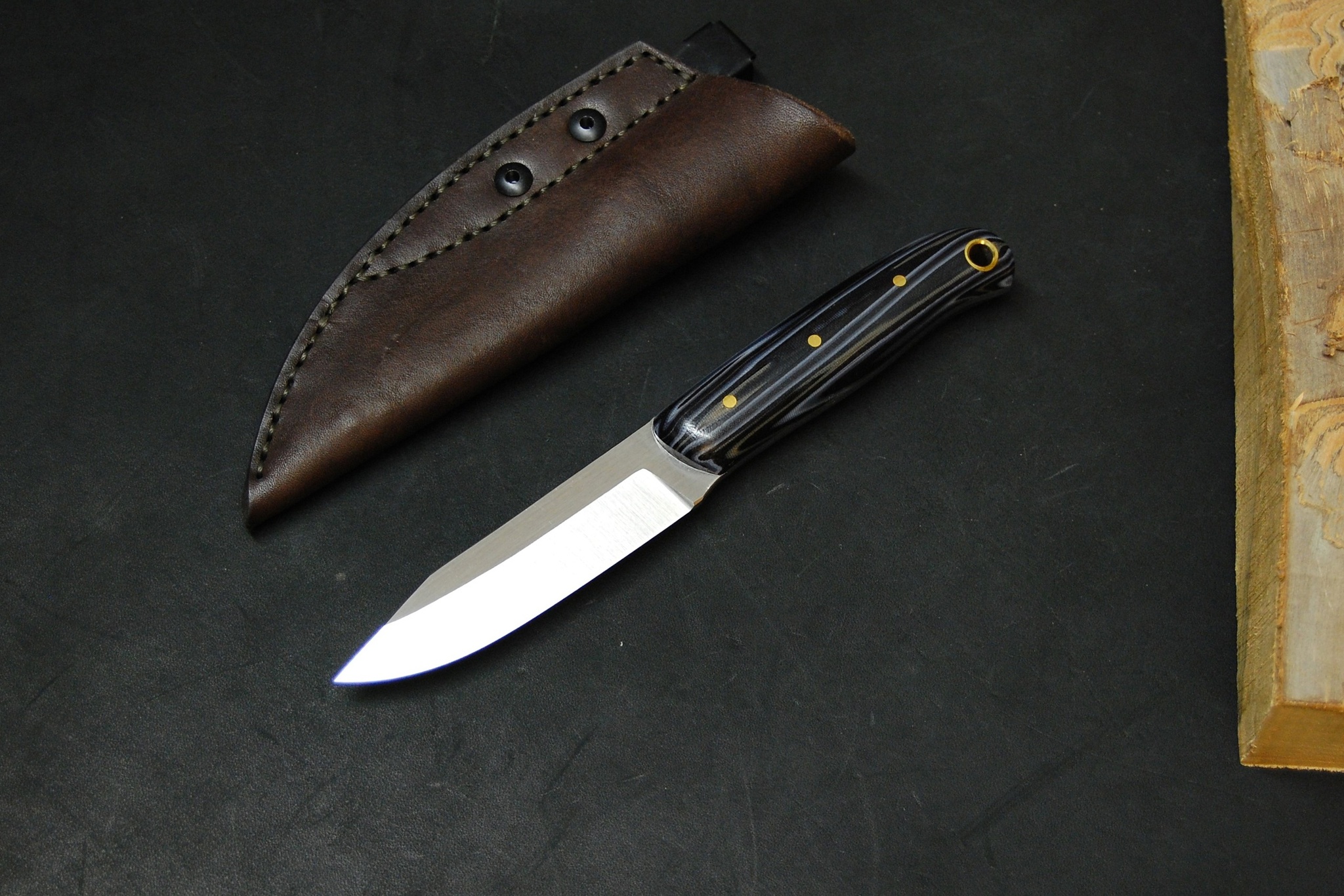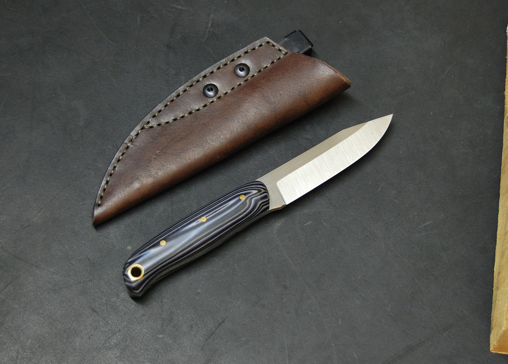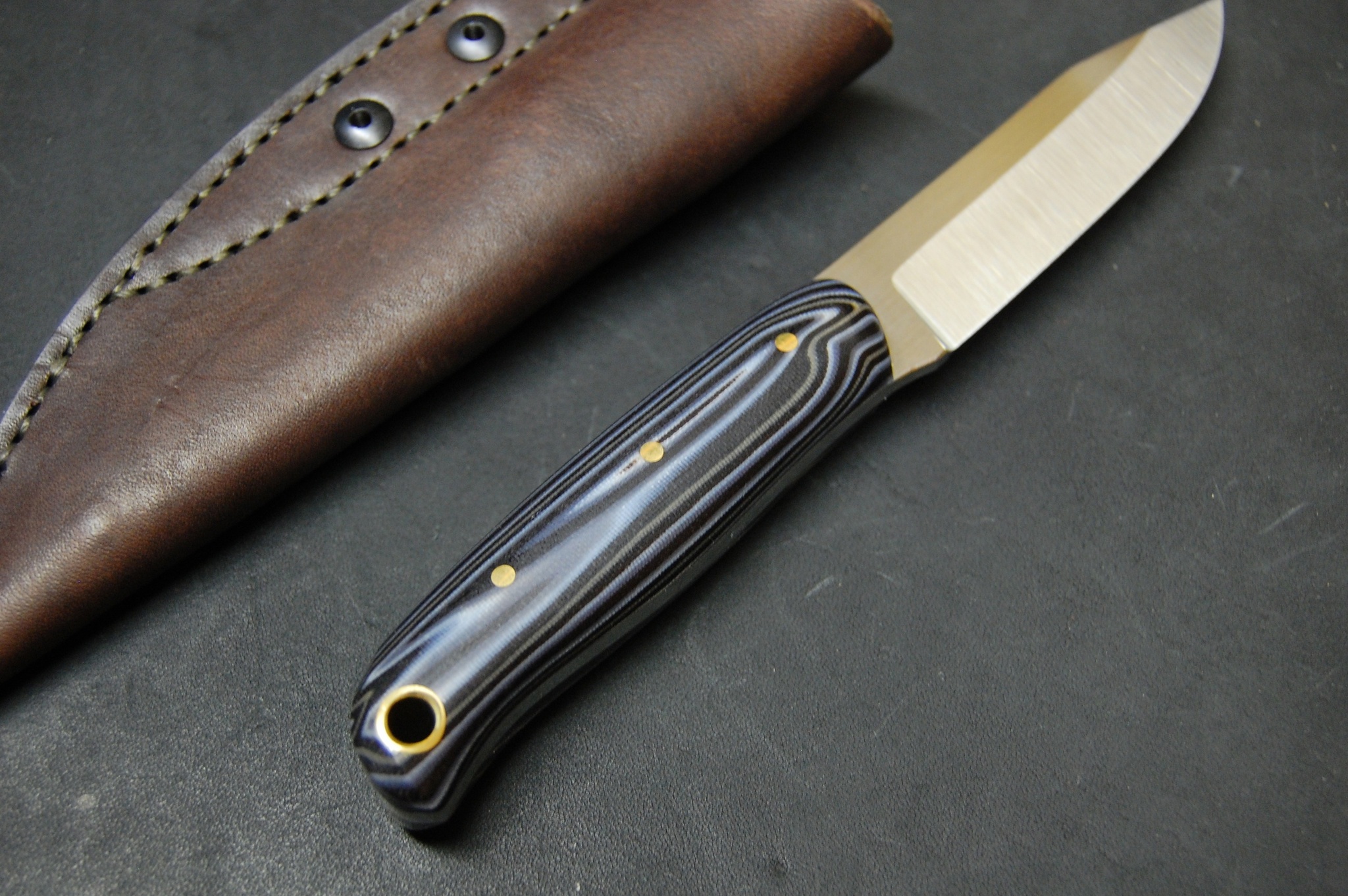 Сталь Aus10co 3 мм толщиной. Спуски прямые, высокие. Голомень и рикассо клинка в продольном сатине. Рукоять из самодельной микарты. Пины латунные 3 мм и темлячное отверстие в виде латунной трубочки 8 мм