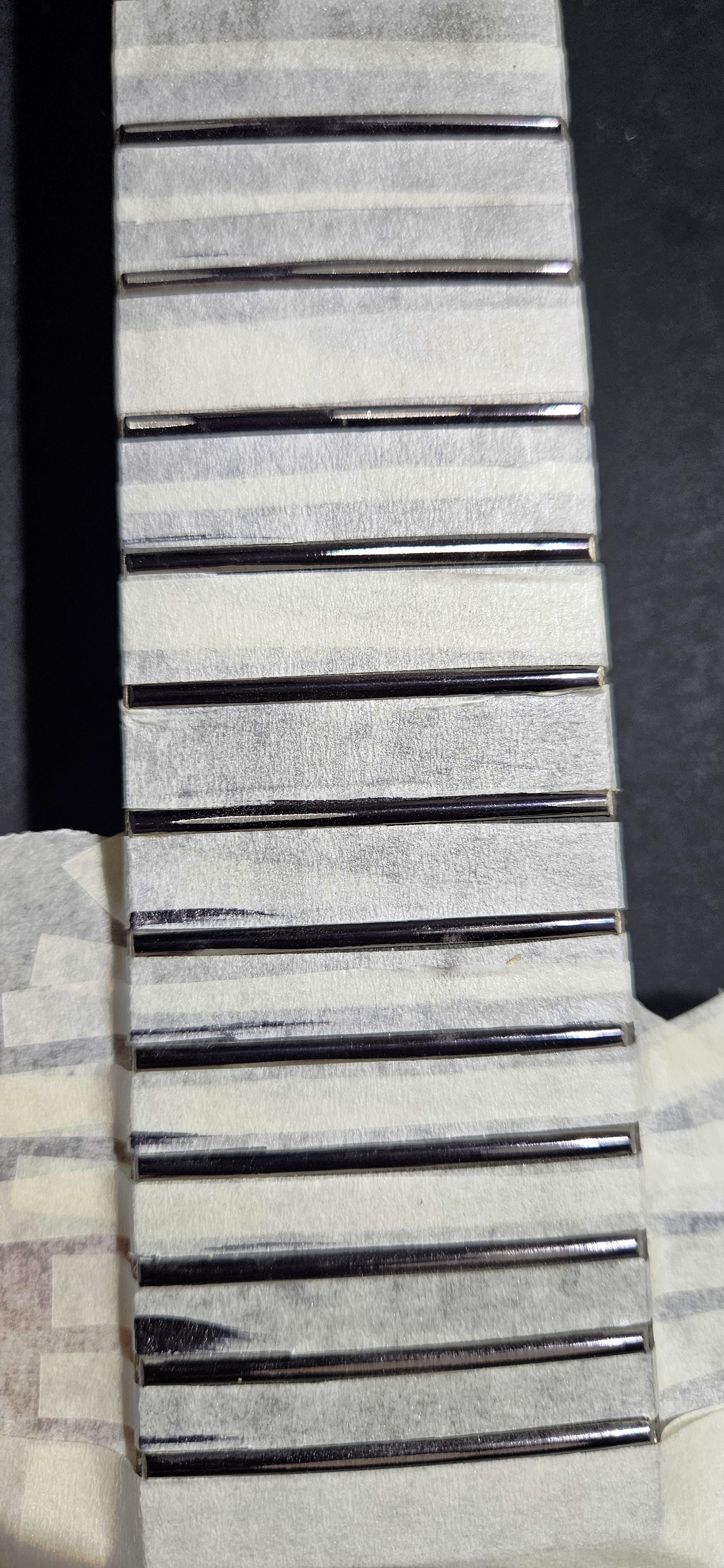 Лады. Еще момент увожения – не самая плохая проволока. Как стандартные синтомсы, вспоминая фабио, на которой два раза провел правилом и половину ладов стер, это плюс. Торцы – ну норм. Немного подкусывают, 10 минут работы надфилем. А вот по высоте набиты плохо. Даже с конской высотой струн изрядно мертвых нот, пришлось сточить где-то 20%. Объективно, это не та гитара, чтобы доставать, сажать на клей. Шлифанул как есть.
