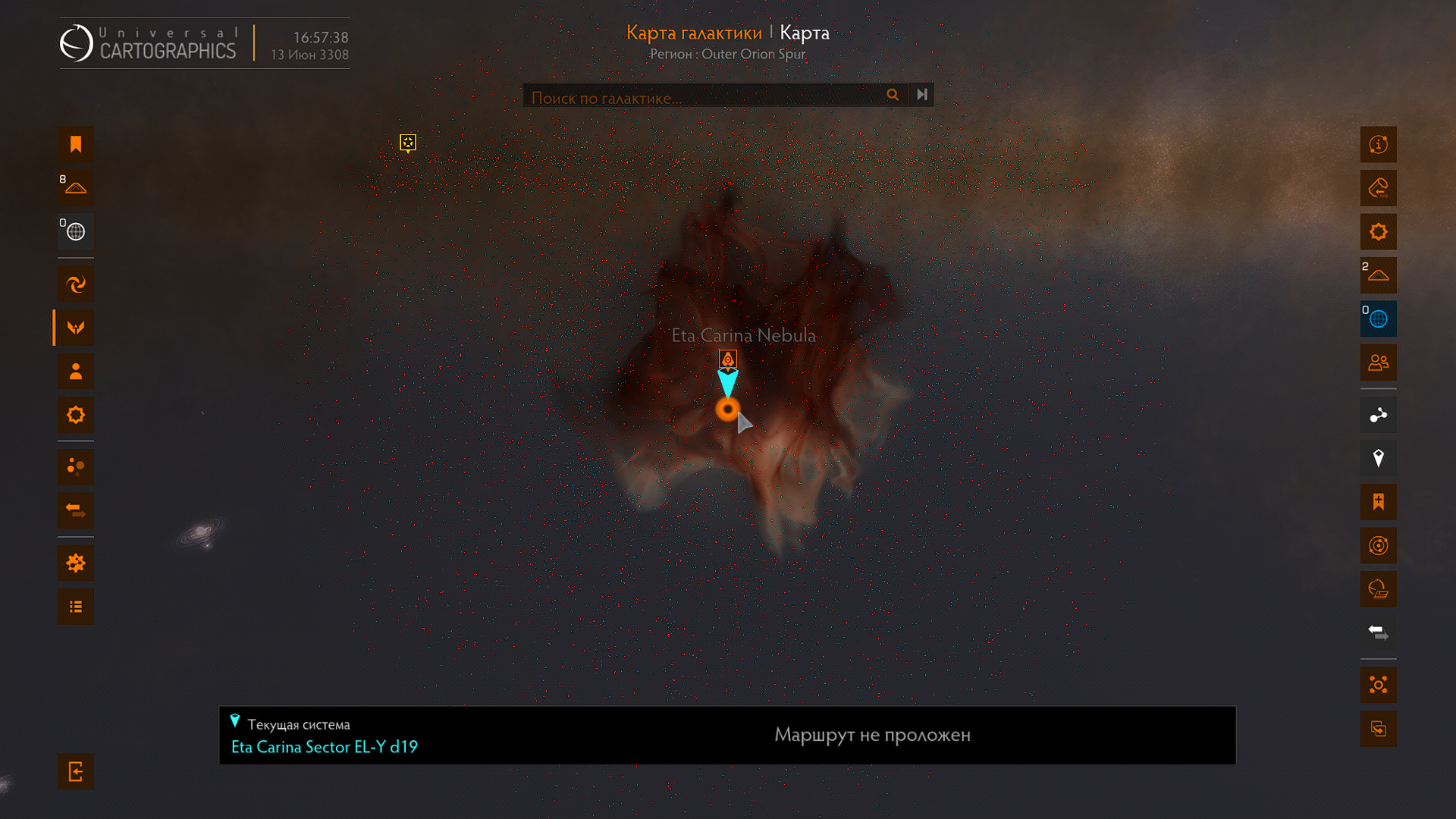 Занесла меня нелёгкая судьба исследователя в соседний сектор Галактики - Outer Orion Spur. Сектор сравнительно небольшой и довольно хорошо изучен. Одной из достопримечательностей сектора является туманность Eta Carina Nebula (9000 св.л. от Sol).
