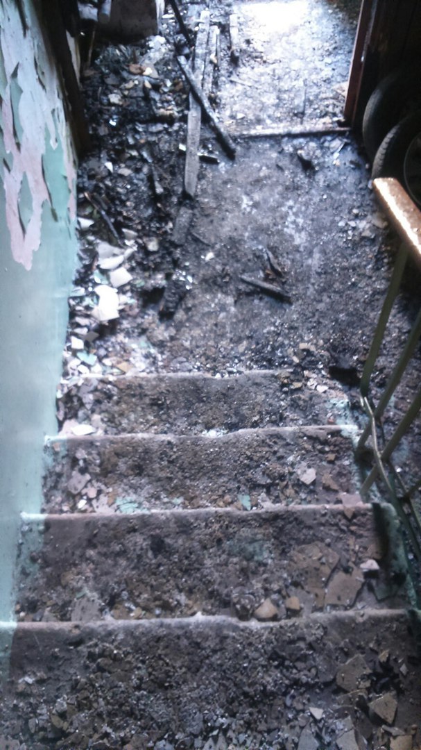 Утром уже увидели, что потрескались стеклопакеты в подъезде, чистые стены затянуты сажей, всем подъездом вышли в попытках всё отмыть и привести в порядок подъезд.
