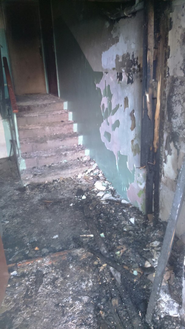 Толпа зевак у дома, в подъезд не пускают. Всё в дыму, подъезд погорел... Ребенок с первого этажа пытался поджечь бумажку... Справился.