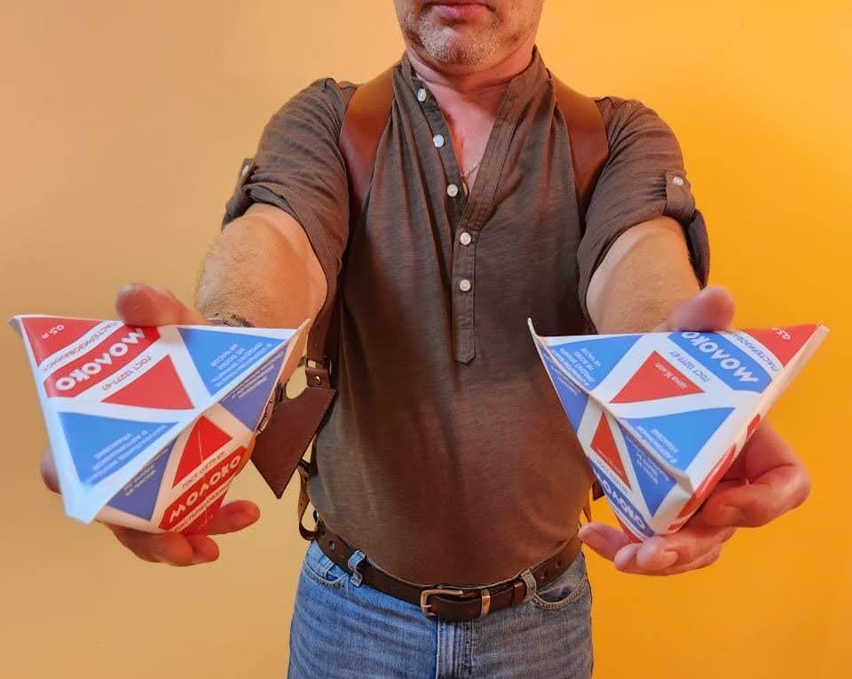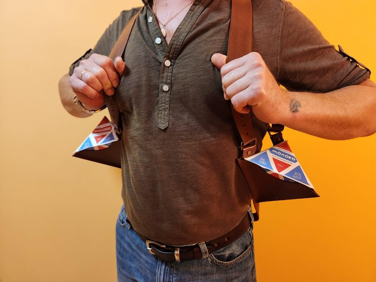 Доброе время суток. Для всех, кто посмотрел этот "шедевр". Этим летом поступил мне заказик на изготовление двух портупей для пакетов с молоком. Даже пакеты получил по почте, что бы все по уму было. Ну заказ я выполнил.К сожалению в фильме портупея мелькнула очень мало, и очень мелко. Непонятно, откуда Семен Семеныч эти пакеты достает. Короче, должно было быть так, как на фото. Ну да и ладно, самолюбие не удалось потешить, хоть деньжат срубил. Да, всех с Новым годом. Не хворайте.