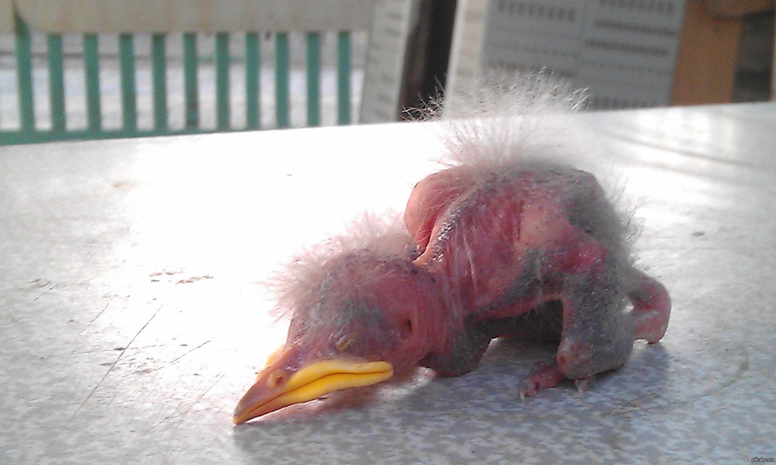 Это птенец свалился с крыши. Два вопроса: Кто это? и Что мне с ним делать? Назад положить не получится.