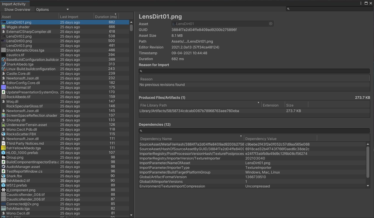 И появилось окно импорта ассетов: позволяет посмотреть дату импорта, предыдущие версии ассетов, список зависимостей, импортеры, используемые для импорта артефакта, длительность импорта и многое другое.