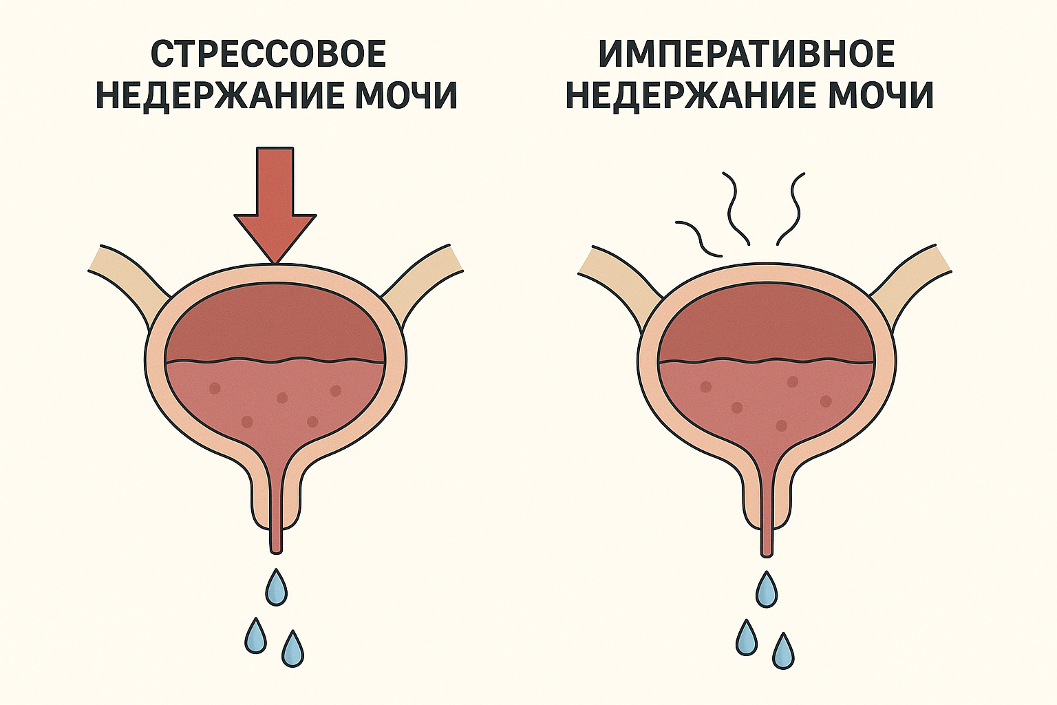 Стрессовое- слабость запирательного механизма в уретре, давление на мочевой пузырь извне. Императивное- гиперактивность мочевого пузыря, неудержимый позыв.