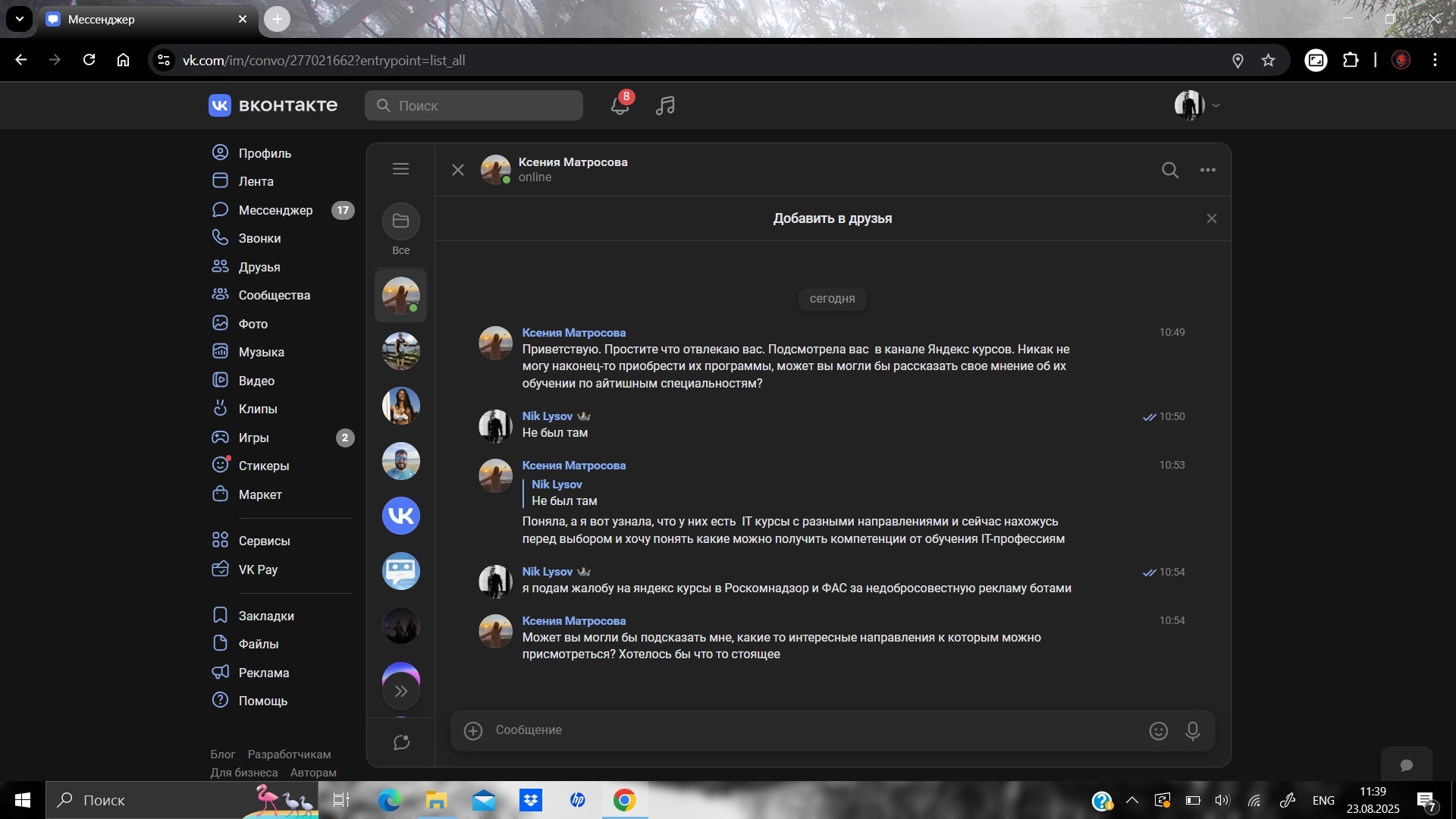 Всем привет. Получил сегодня сообщение в VK. Бот по имени Ксения отправил сообщение с вопросом, что якобы пользователь увидел меня на Яндекс курсах и просит совета.