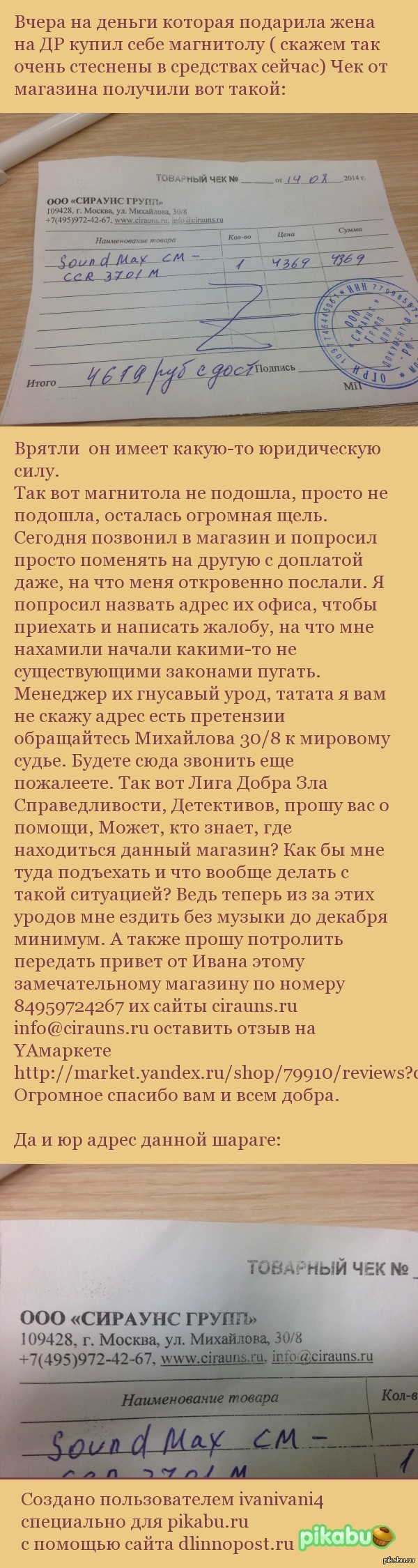 Только что позвонил!!! Туда!!! Вот что мне ответили... Я чисто по человечески готов был вашу решить проблему! Но так как Ваня ваш начал сходу орать и материться на меня, я ему посоветовал решать проблемы в правовом поле. Я понимаю,что подарок я понимаю что нервы и все такое. Я что ли виноват что он не верную магнитолу выбрал? Поменял бы без проблем, еще раз говорю, если бы этот мудак не начал права качать сходу и пытаться меня запугать и наехать. Пусть валит в суд, по суду обменяю. И пусть винит себя в своем неадекватном поведении.