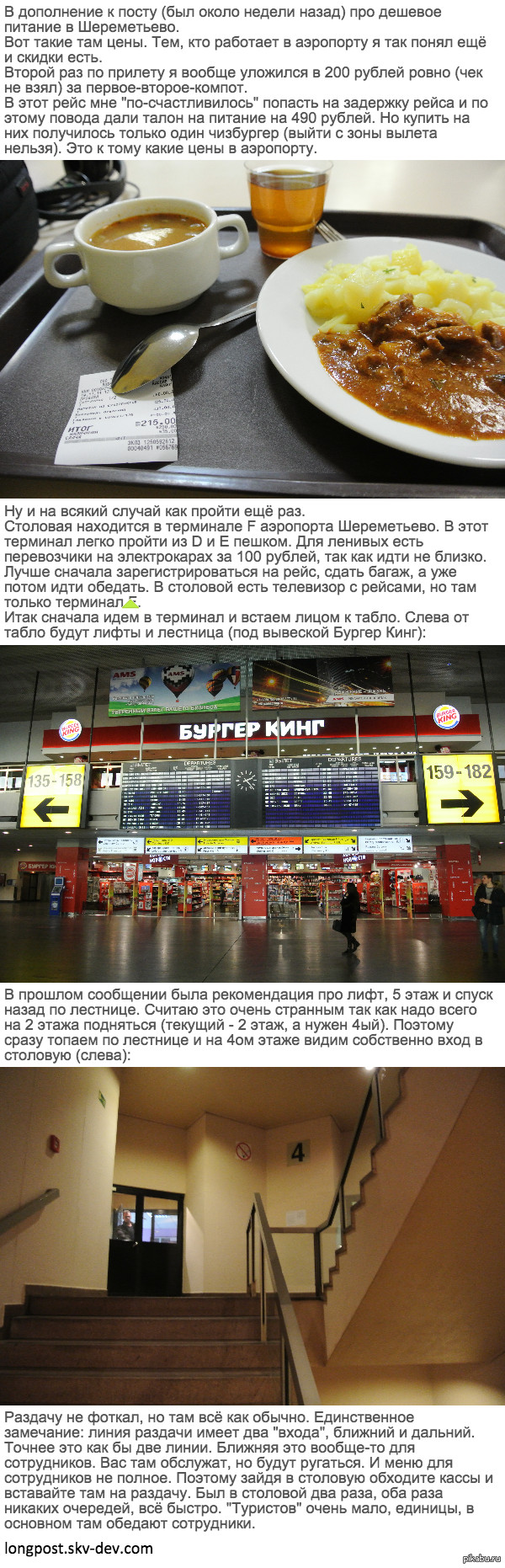 "Еще два места в здании Аэроэкспресса: 1. Столовая на втором этаже в районе лифтов - комплексный обед 230 рублей. 2. Кафешка на третьем этаже у выхода на перрон Аэроэкспресса - комплексный обед 220 рублей, шаурма на тарелке 175 - курица, 215 -баранина. А в ней реально куча мяса, достаточно гарнира и лепешка с мясом в комплекте. Все чистоплотно и довольно по-человечески."