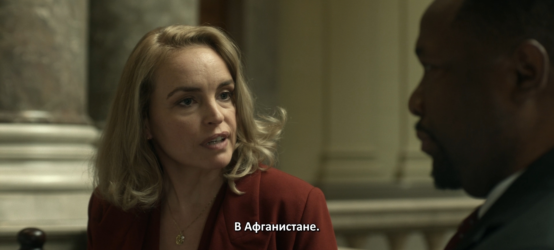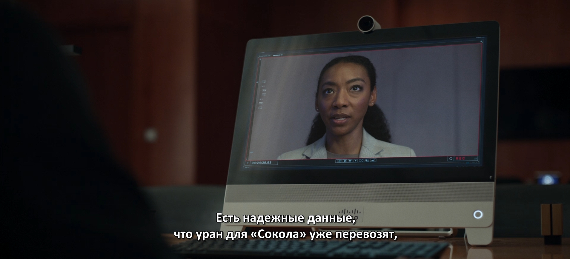 Она докладывает, что Райан обнаружил уран для необнаружаемой ядерной бомбы. Вот только куда она смотрит? Почему она смотрит не в камеру, а куда-то вверх?