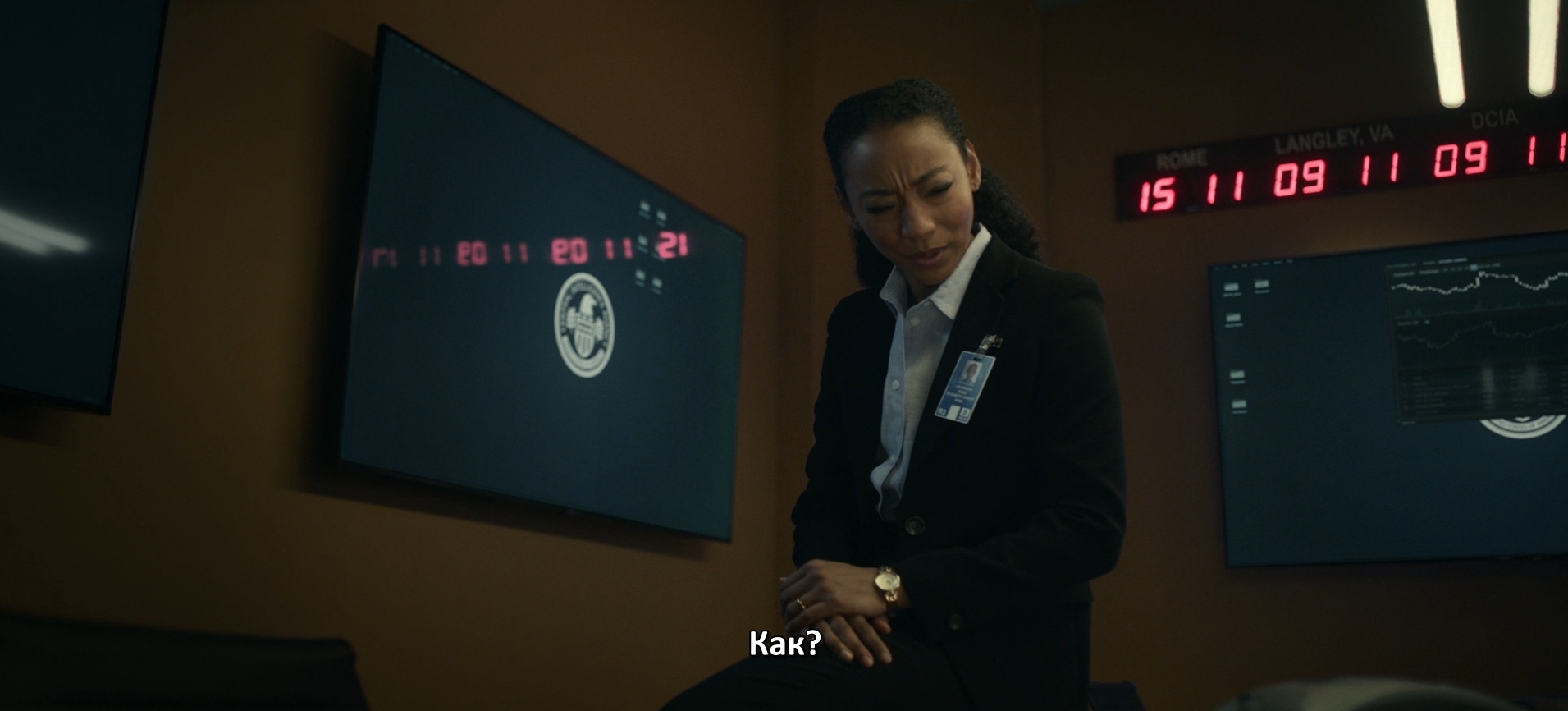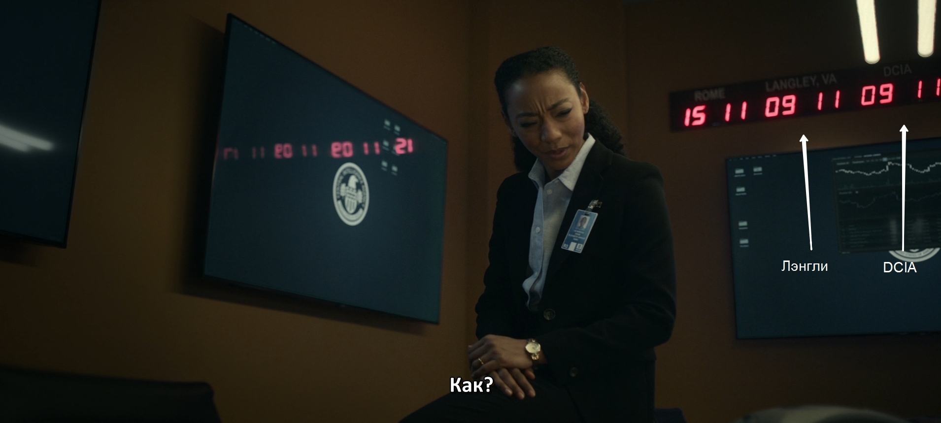 Кстаааати! Видите часики над монитором. У неё одни часы показывают время в Лэнгли - штаб-квартире ЦРУ, а другие показывают время в DCIA. И я честно не знаю, что это такое. Может быть это Директор CIA (ЦРУ), может это "домашнее" время ЦРУ (от англ. domestic CIA). Может и что-то другое, но! Время часы показывают одинаковое )))))))