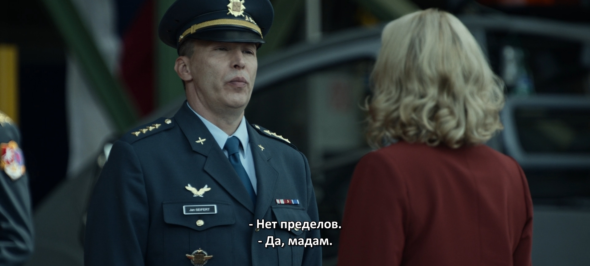 А на этом кадре вы видите негативную красоту перевода. В оригинале солдат сказал "нет, мадам". Нам перевели "да, мадам". Смысл сохранился, но так делать нельзя. Переводчик не должен брать на себя роль интерпретатора смысла слов персонажа. Он сказал "no", переведи как "нет".