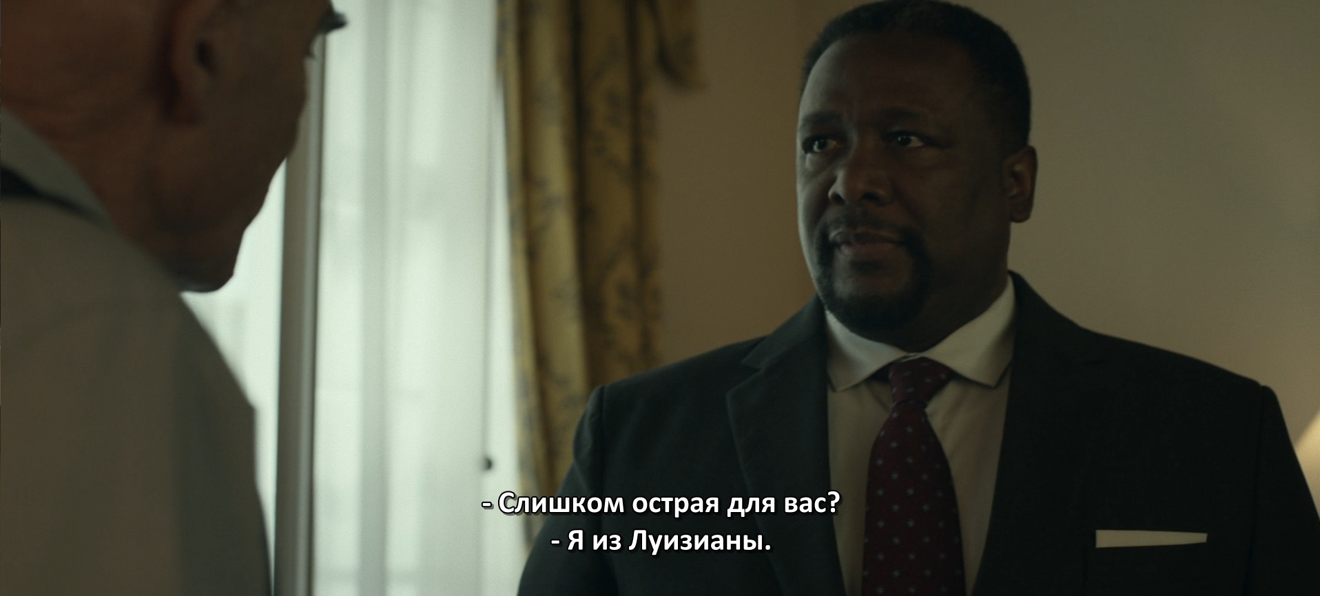 И вот вооружившись знанием этим начальник Райана пошёл к отцу президентши, чтобы узнать что-нибудь о её же начальнике охраны, а заодно и ошарашить отца своими познаниями русского языка.
