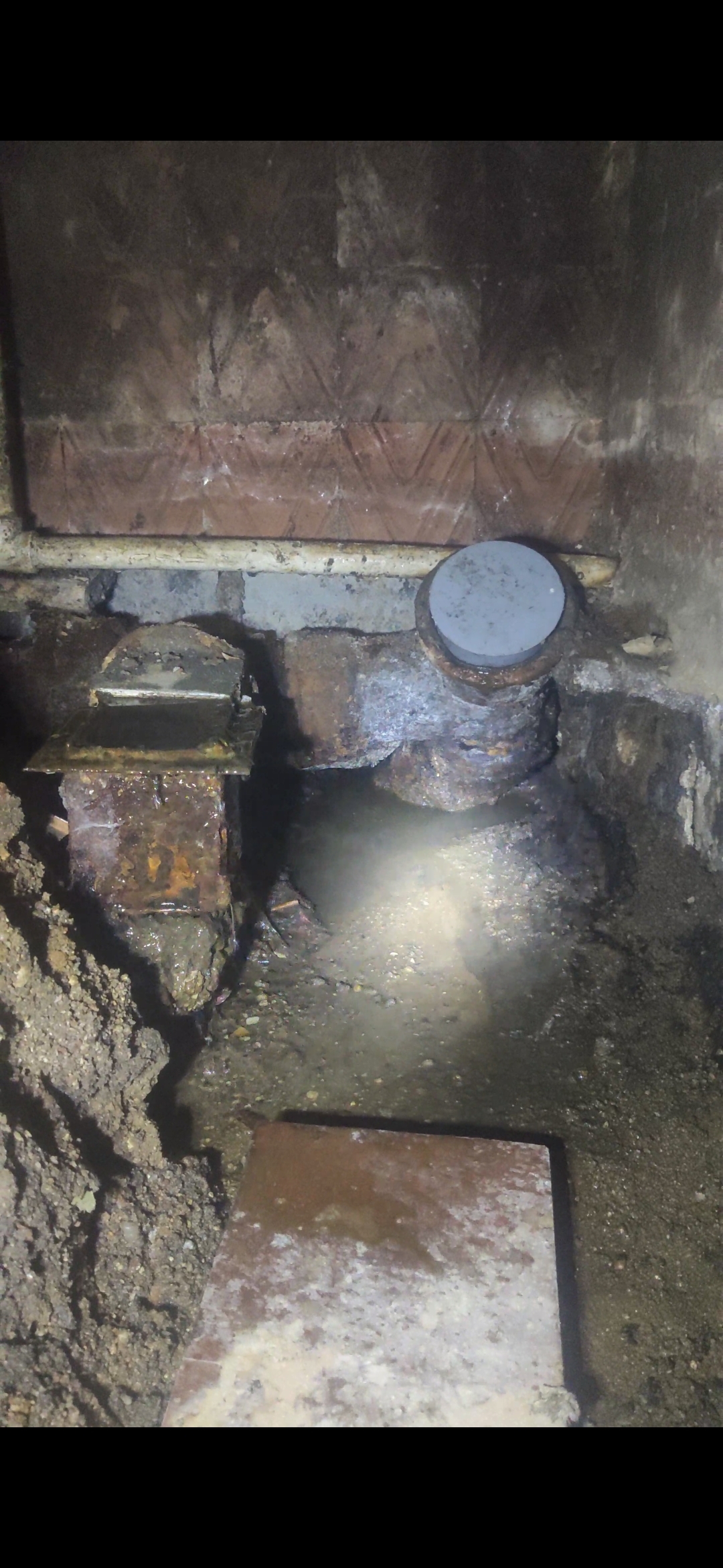 Как я уже выше упомянул, что помещение где была забита канализация, было когда то выделено под душ. Разобрал пол. Поставил в одно отверстие заглушку. Вот так это всё выглядит.