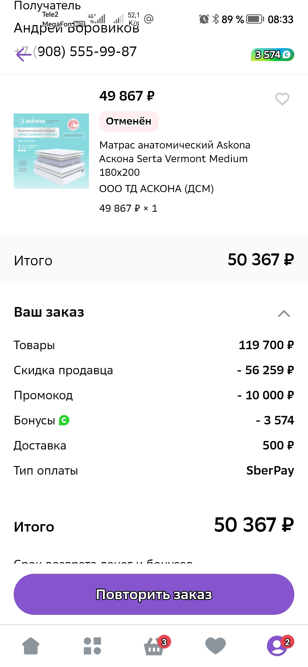 31.01 21:00 закзали в МегаМаркете матрац Аскона Serta Vermont Medium за 63441р, применив промокод на 10000р.(действовал до 31.01). Буквально через 10 минут увидел матрац Аскона Grether&wells regal и так как давно на него заглядывался решил отменить первый и купить regal. Но отмена не проходила, после чего связался с оператором на горячей линии. Оператор сказал что "в данном заказе отменить может только продавец". Так же что "заказ точно не отменится". Решил оставлять все как есть. С утра 01.02 обнаружил что заказ все же отменен, промокод на данный момент ПРОСРОЧЕН. Связываюсь с оператором с вопросом как так?! Ответ, ну вы же просили отменить заказ... И ни кого не интересует что предидущий оператор сказал " заказ точно не отменится". Прошу как то попробывать восстановить промокод, ответ : технический сбой, оставить заявку не возможно! Задаю вопрос как мог предидущий оператор сказать что заказ точно не отменится, а потом отменить заказ?! Ответа нет.