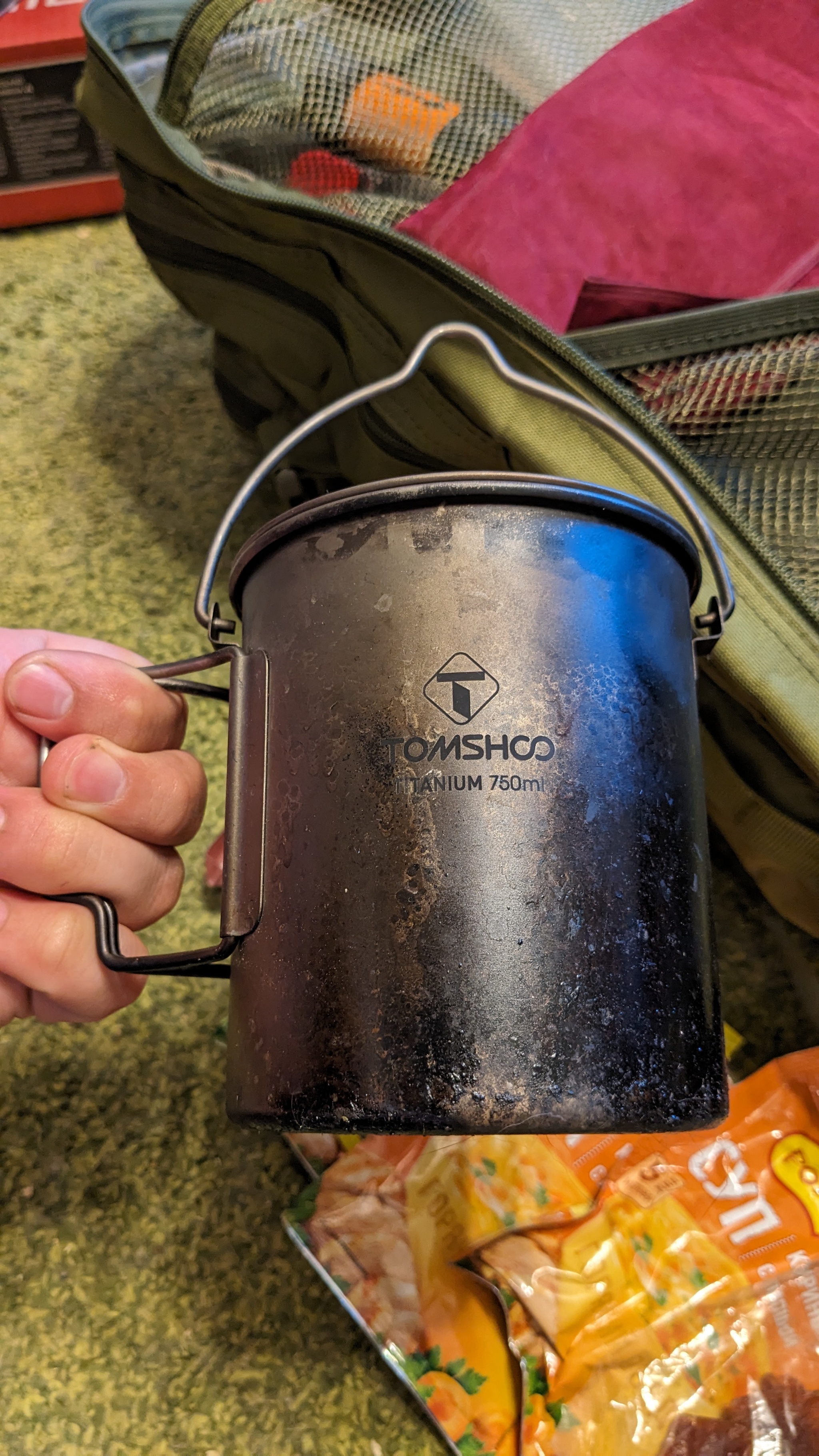 Для одиночного похода можно взять только кружку. Большую кружку. В данном случае у меня титановая кружка-котелок. Титан дольше греется, чем сталь или алюминий, но и дольше хранит тепло. А та же он легче стальной и прочнее алюминиевой. Для большего комфорта можно , конечно взять ещё тарелку, главное грамотно упаковать. Кстати, снова про упаковку