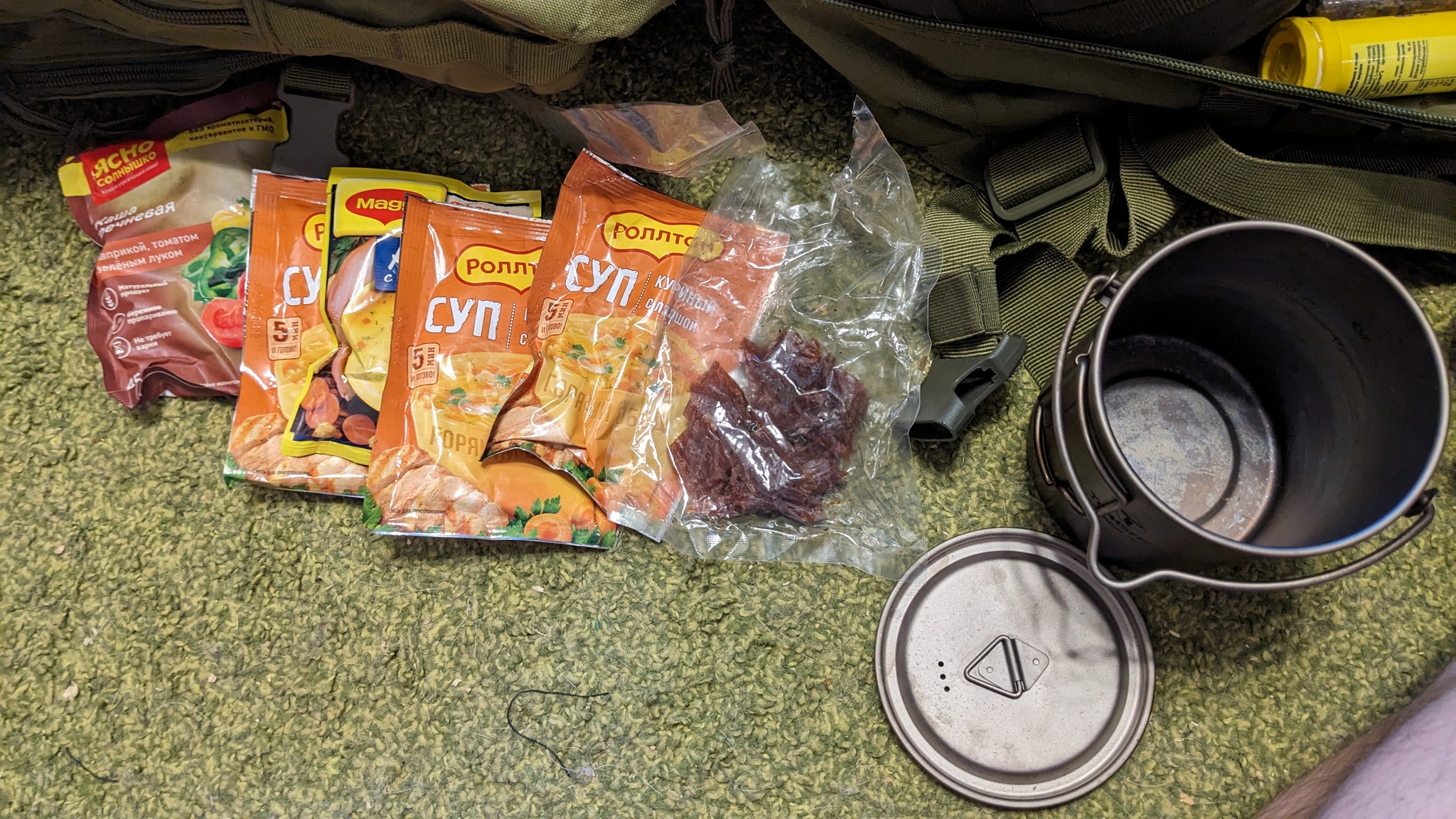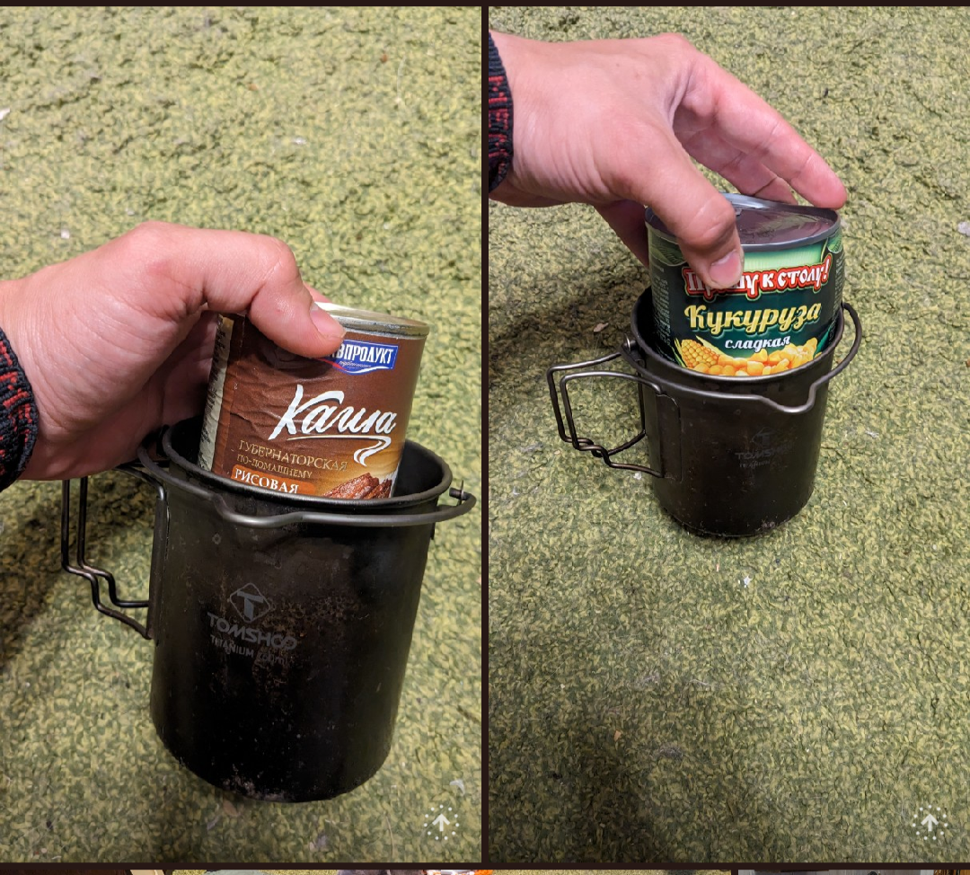 Чтобы сохранить полезное место, в кружку я засунул сухие супы, кашу и вяленое мясо. Также сюда можно засунуть консервы, но не все. Плоские банки с тушенкой сюда не влезут, но длинные спокойно помещаются. И кукуруза/горошек тоже. Если надо, ссылку скину на кружку, есть такая же, но стальная и подешевле. Кстати, хорошо стоит на горелке.