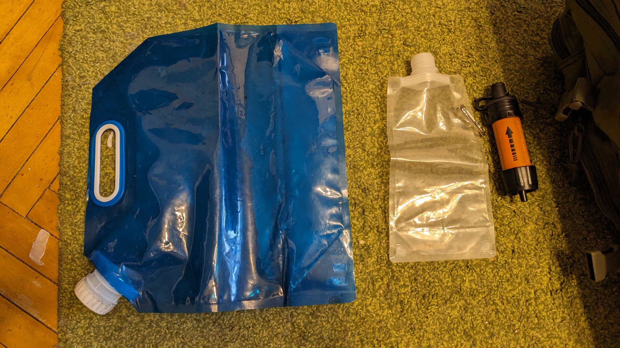 Хорошее место для лагеря не всегда бывает с хорошим подходом к воде. Эту проблему в походе отлично решит складная канистра. Места не занимает, весит немного, стоит в районе 300₽. Есть ещё вариант с краном, тогда канистру можно удобно подвесить на дерево или верёвку и использовать как умывальник ( соблюдаем правило №2) У такой канистры есть только два минуса: прочность, и наполнение. Чтобы заполнить такую канистру, придётся взять кружку, потому что если просто засунуть её в воду, она... сложится 😅. А в целом отличная вещь, только не берите 10 литров, лучше одну или две по 5 если компания большая, чтобы не резало руки при переноске. Справа от канистры находится фильтр и складная бутылка, на случай сомнения в чистоте воды и нет возможности её быстро вскипятить. Брал на алике, справляется на ура, место занимает немного.
