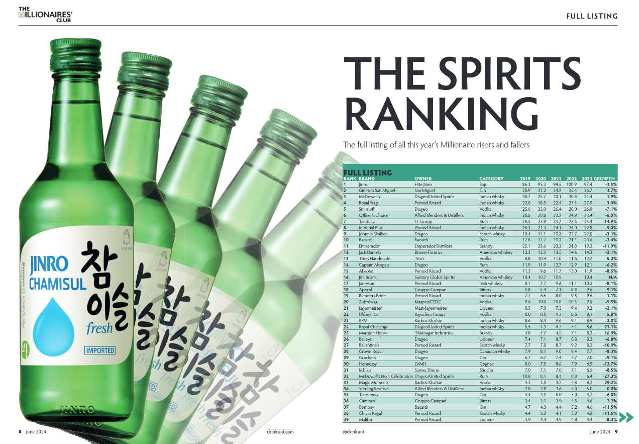 Тройка лидеров The Millionaire’s Club 2024 получилась такая: на третьем месте индийский виски под названием McDowell’s, на втором филиппинский джин Ginebra San Miguel, а лучшим алкогольным напитком в мире признали корейское соджу под брендом Jinro.