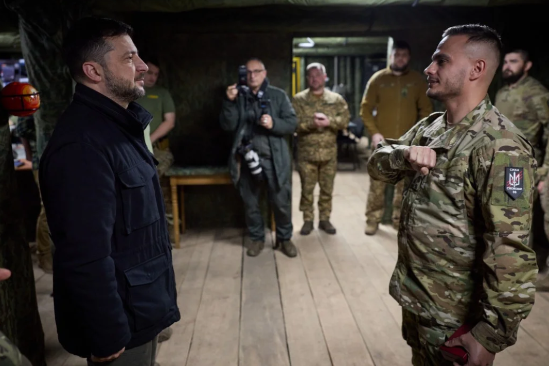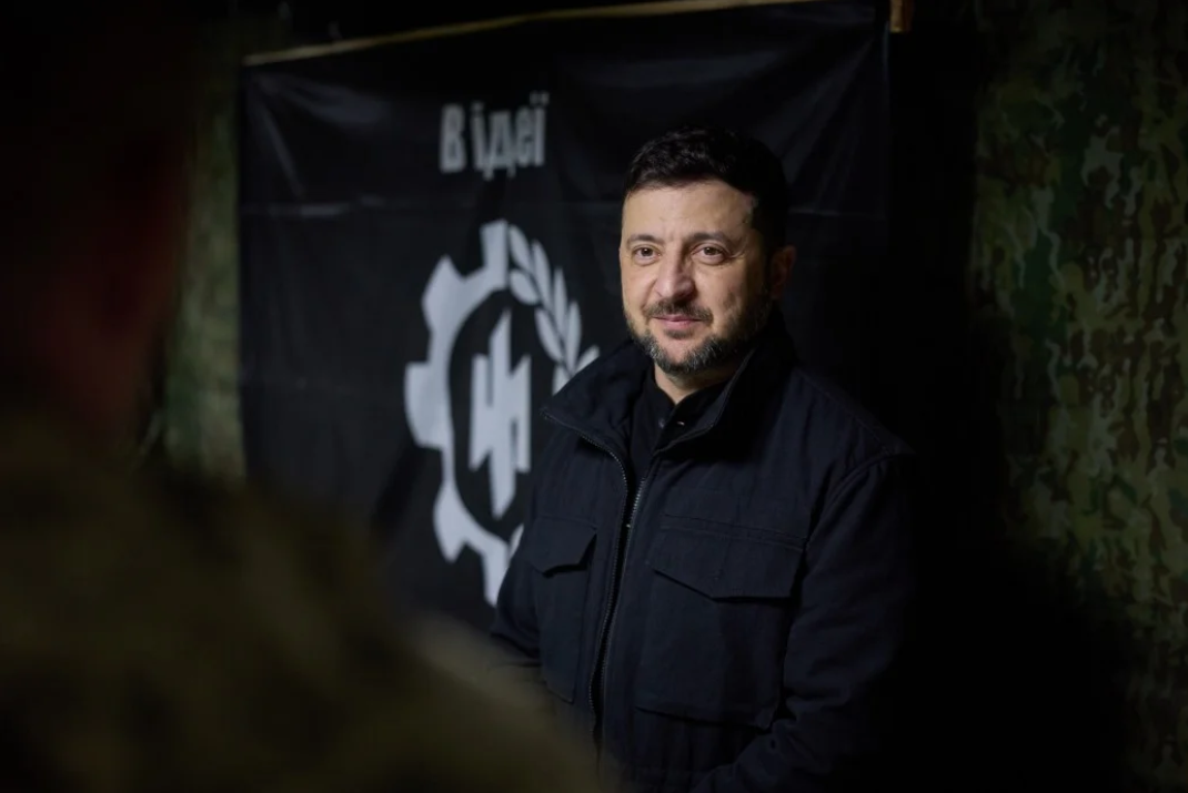 Не монтаж. Еврейский президент Зеленский во время посещения добровольческих подразделений на Донецком фронте 4.11.2025 на фоне нацистского символа бригады «Рубеж».