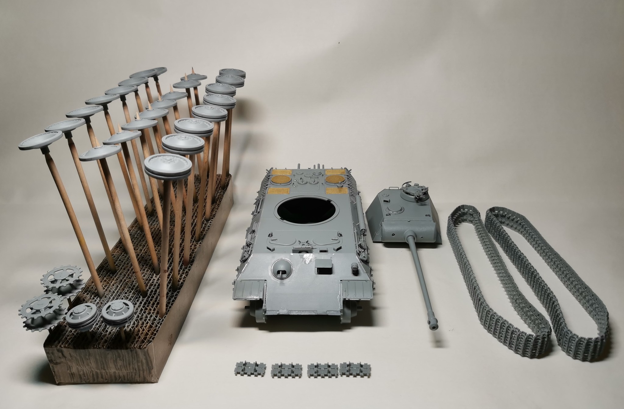 Первым делом были окрашены резиновые бандажи на опорных катках и задуты в базовый цвет гусеницы: