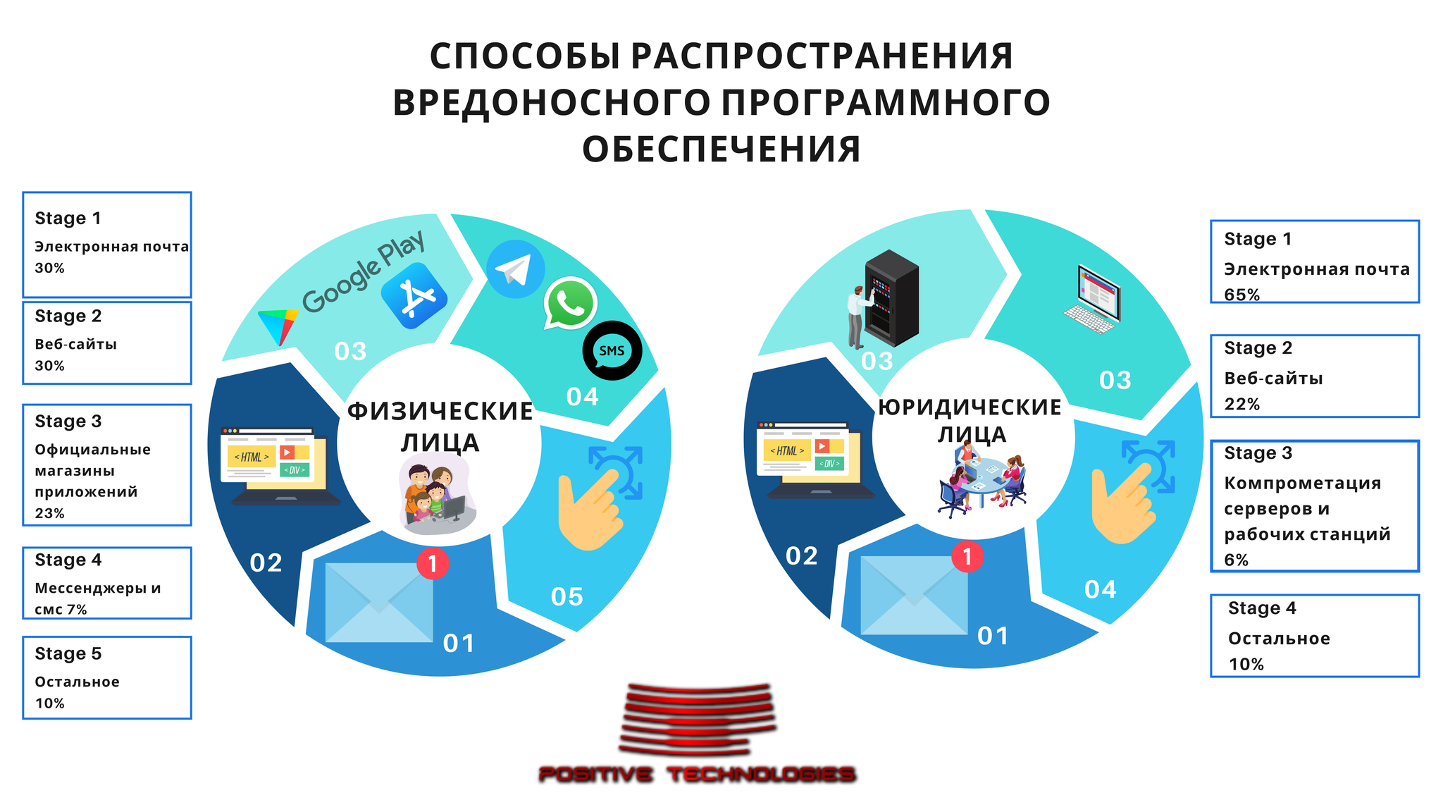 Помимо сбора информации о нас для формирования цифрового портрета, данные о нас собирают вредоносные сайты, которые не всегда блокируются средствами защиты информации, некоторые даже не оповещают об этом и для закрытия этого вектора угроз нужна эшелонированная защита. На рисунке 3 мы видим, что первые два места по распространению вредоносного ПО занимают веб-сайты и электронная почта.