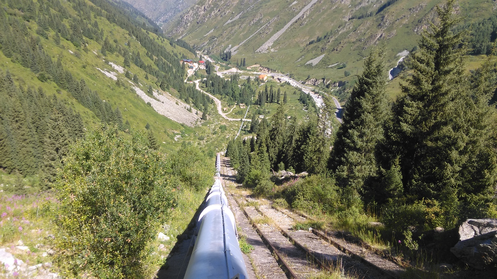Поход к озеру производится непосредственно по трубе или рядом с ней. По трубе мне больше нравится. Первый подъем самый тяжелый - градусов 35-40,а по ощущениям больше.