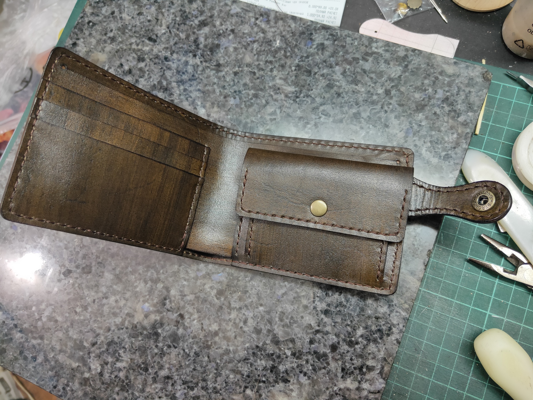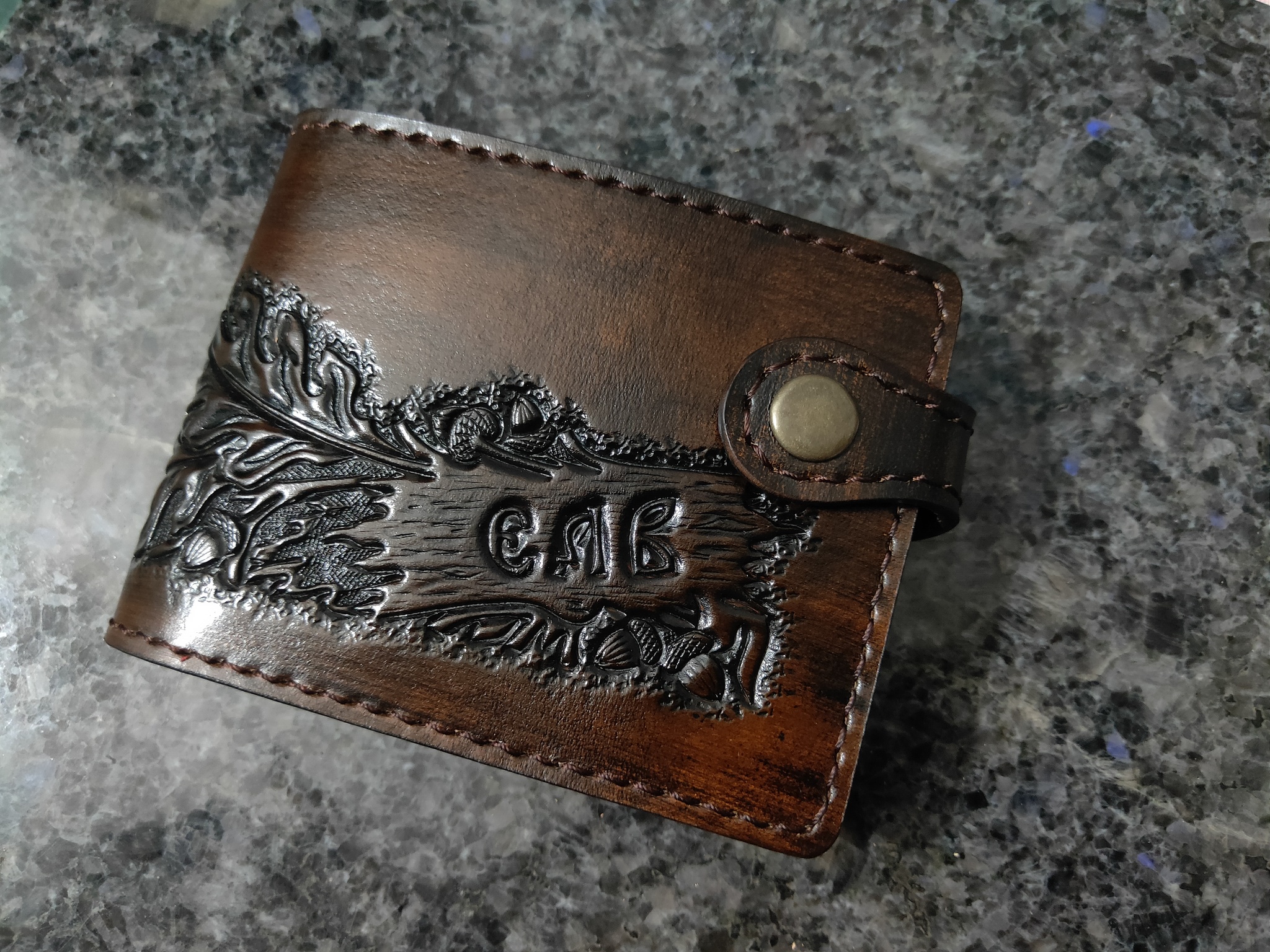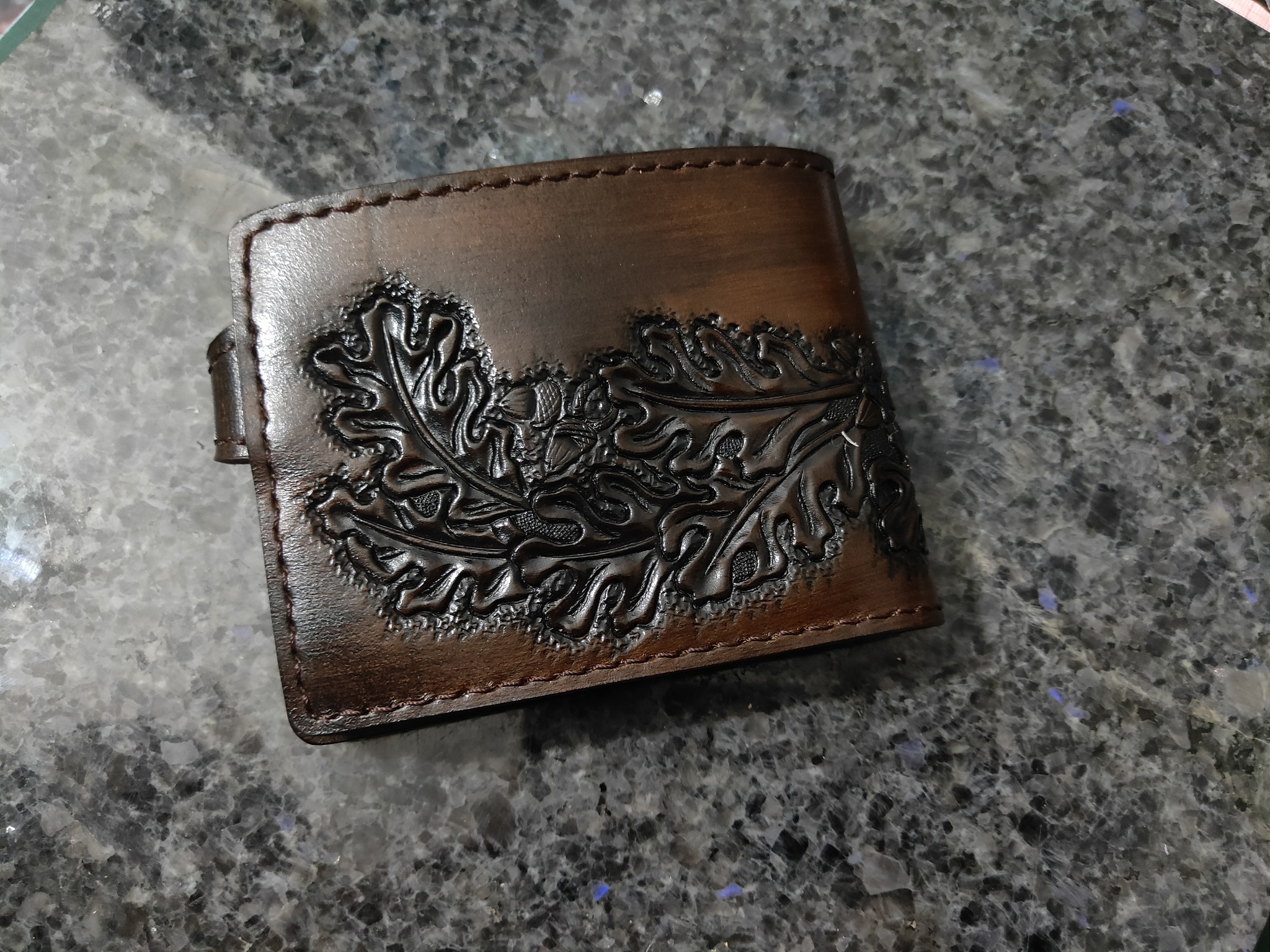 Вот такой именной кошелек получился. Аккурат перед болезнью и успела отослать. Наружка из Херманн оак, внутрь Осташков 1мм. Окраска античным гелем ЭКО Фло. Ниточка Винимо.