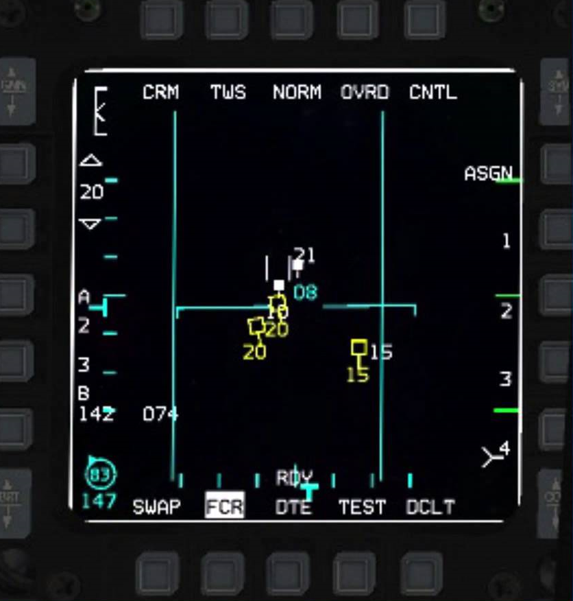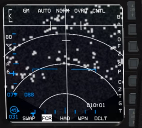 На MFD радар "расположен" в меню как FCR. Работать он может так-же в нескольких режимах и подрежимах. Опять же, не будем конкретно разбирать каждый подрежим, но некоторое описание все-же будет =)