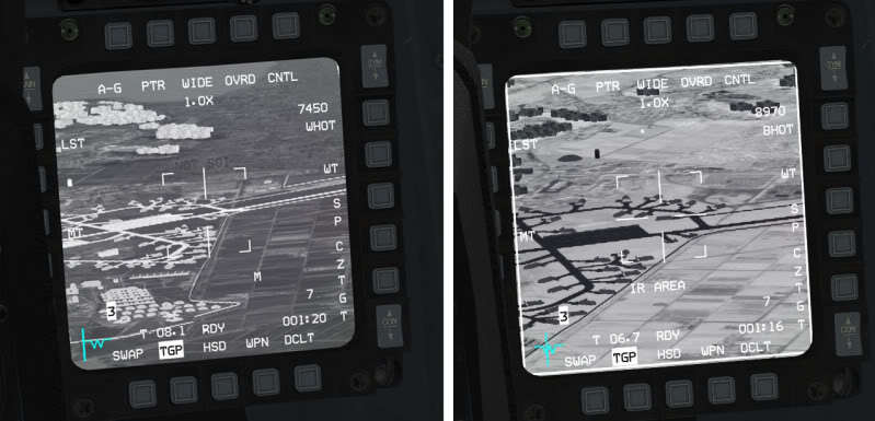 Конечно никто не будет "водить" TGP по небу в поисках цели, да и по земле в принципе тоже. TGP конечно работает с другими система самолета, такими как FCR (Fire Combat Radar) (о нем читайте дальше). Или TGP скажем может наводиться на заранее заданную точку (STP - SteerPoint).
