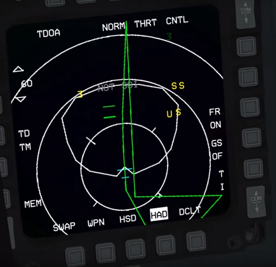 HSD - это просто навигационное меню. На нем показывается маршрут, заранее записанные угрозы (ПВО в виде их обозначения символьного и иногда радиуса действия), область сканирования FCR и тд.