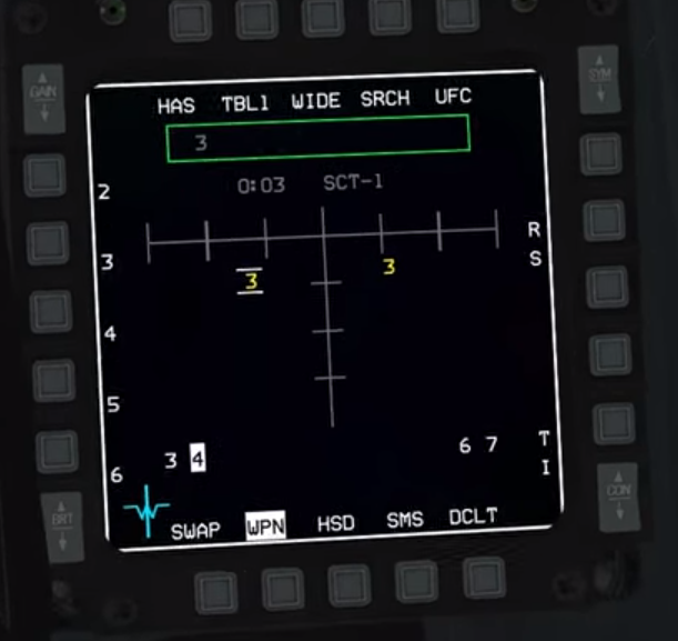 HTS - HARM Targeting System. Предназначен этот модуль для поиска радаров различных типов. Конечно система умеет даже понимать, какой именно радар ее облучает и в каком режиме (сканирование, захват). У пилота на MFD для этого есть режим HAD, выглядит следующим образом