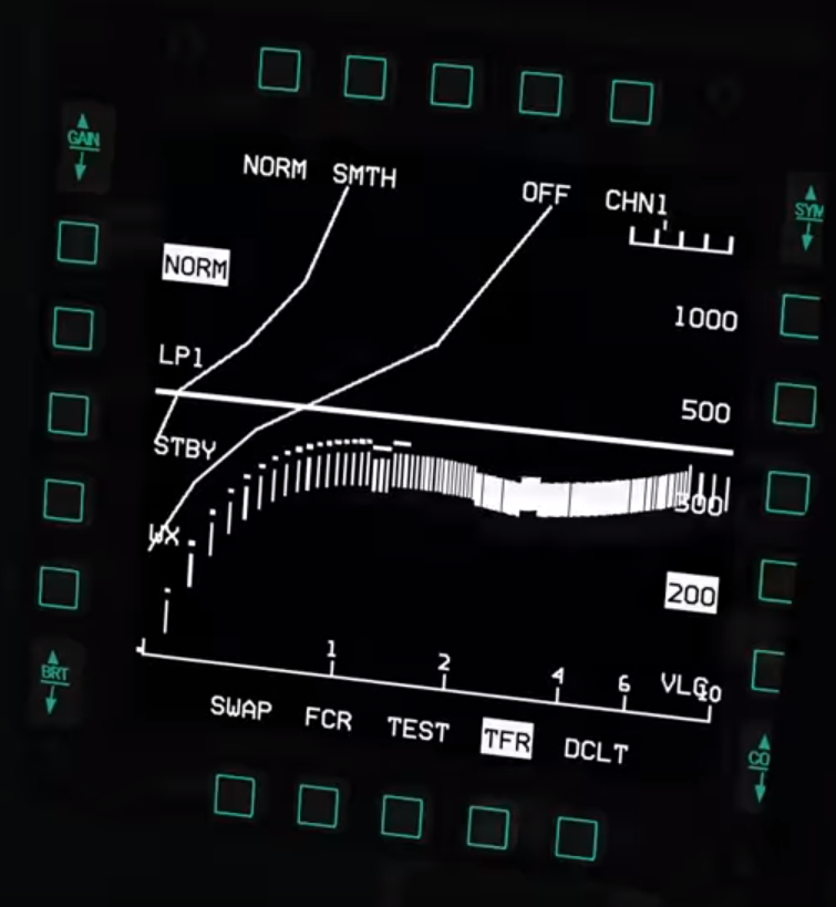 TFR - при некотором варианте модулей F-16, а именно LANTIRN доступен Terrain following radar. Он позволяет скажем удерживать в режиме автопилота высоту 100 футов, при этом огибая местность. Великолепная вещь. Может так-же работать в ручном режиме или только, когда самолет был направлен в гору\возвышенность брать управление на себя.