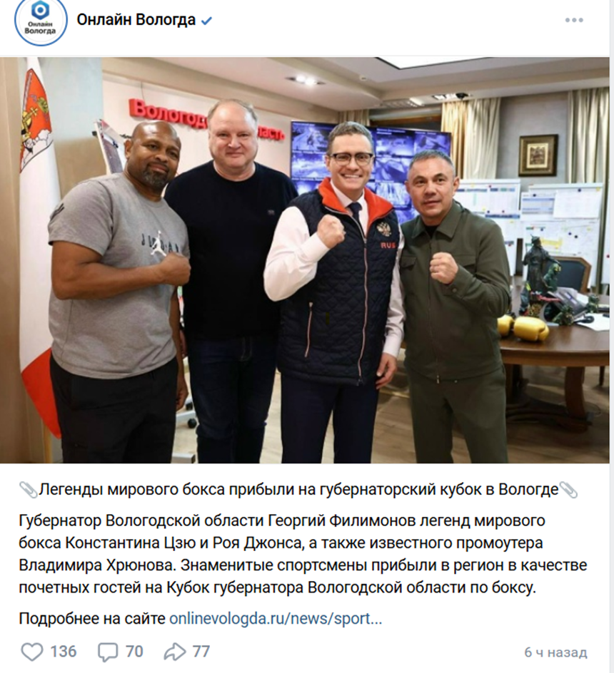 В целом, реклама области прям активно идет: например, один из фаворитов голосования за статус культурной столицы. Думаю, это хорошо. Например, некоторое время в команде губернатора работал звезда бокса Александр Поветкин, не долго правда, но звучит внушительно! Сейчас вот кубок губернатора по боксу, звезды разные приехали, Костя Дзю, Рой Джонсон, например. Да и в целом, любовь к спорту у губернатора не отнять: собственные достижения молодости, внушительные вложения в школу единоборств в Череповце, где, кстати, работает его отец, общение с мастером ушу во время поездки в Китай (дада, область активно контактирует с ним и с Белоруссией, ну как минимум, в СМИ так пишут), подарок Алексею Мордашову (обратите на это внимание) перчаток и фраза типа «вызвать на татами, ковер или ринг» в адрес неизвестного представителя индустриального микросоциума с транснациональным «отливом» и деньгами… (https://www.fontanka.ru/2024/11/15/74339348/)