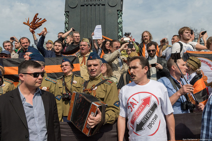 Начало было назначено на 14:00. Но уже за час до начала пятачок около памятника Пушкину заняли прокремлевские активисты. Были НОДовцы во главе с депутатом Федоровым и Катасоновой. Были люди из движения SERB, которые регулярно нападают на активистов оппозиции. Было много казаков. Они сразу отметили себя георгиевскими ленточками и начали скандировать, что поддерживают Путина.