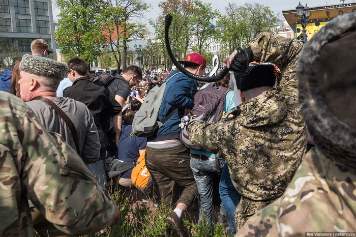 Но уже вскоре начались мелкие стычки с казаками. Они начали оттаскивать сторонников Навального в довольно грубой форме. Те им отвечали, завязывались стычки. Откуда взялись казаки, никто так и не понял. Их было около полусотни. Часть из них — представители «московского казачества», но были и казаки из Крыма, у некоторых были нашивки «Вежливые люди». Как они оказались в центре Москвы, кто их привез и зачем, они не отвечали.