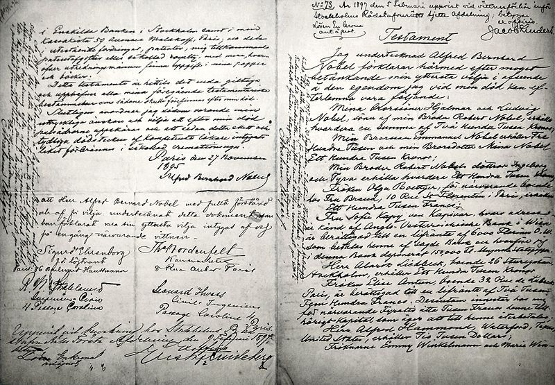 10 декабря 1896 года Альфред Нобель умер на своей вилле в Сан-Ремо (Италия) от кровоизлияния в мозг. Его завещание, составленное им 27 ноября 1895 года, было оглашено в январе 1897 года. В нем было написано следующее: