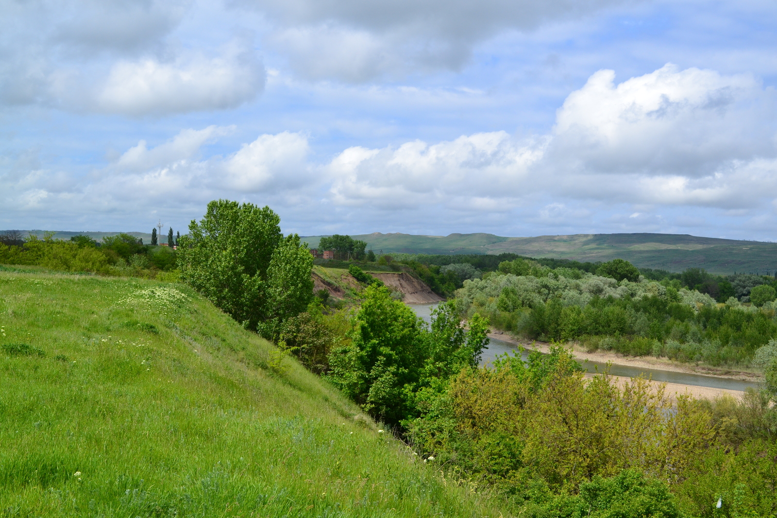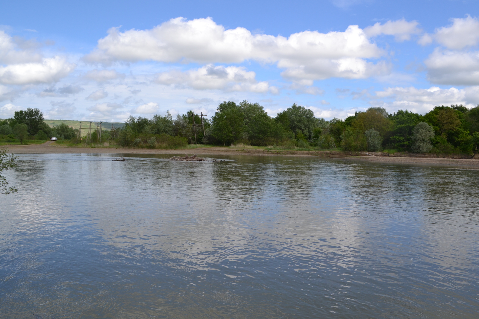 Пока еще спокойная Кубань. Там где я стою (где-то с метра полтора до воды), вовремя половодья, иногда стоит вода, а бывает что подходит до самой кромки берега.