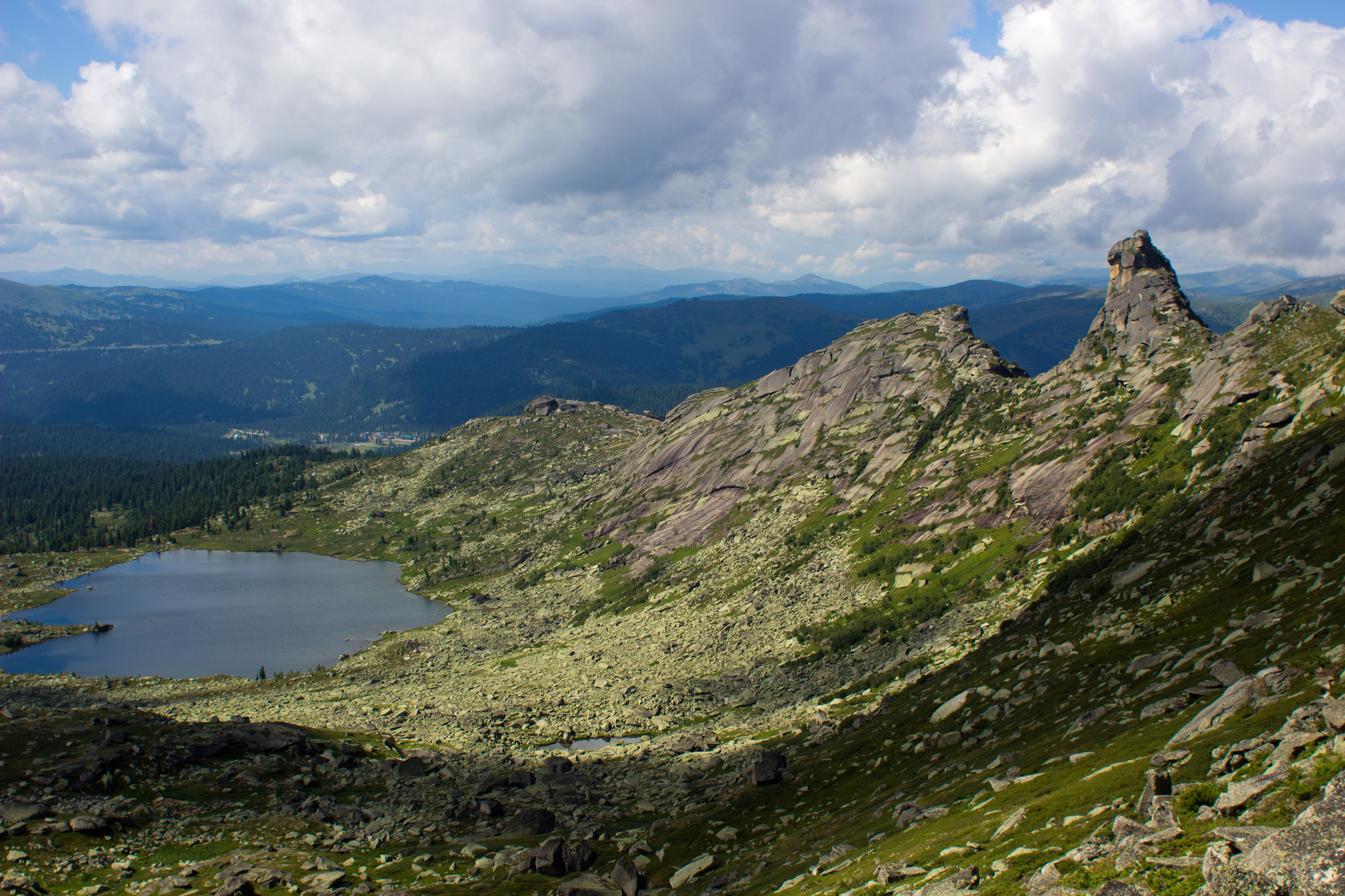 Ниже на фото можно увидеть огромный завал камней - курумы высотой с двухэтажный дом. Чтобы пройти после спуска к озеру потребуется попрыгать, полазить и даже поочковать за некоторых членов группы - часа три, а с высоты кажется все просто.