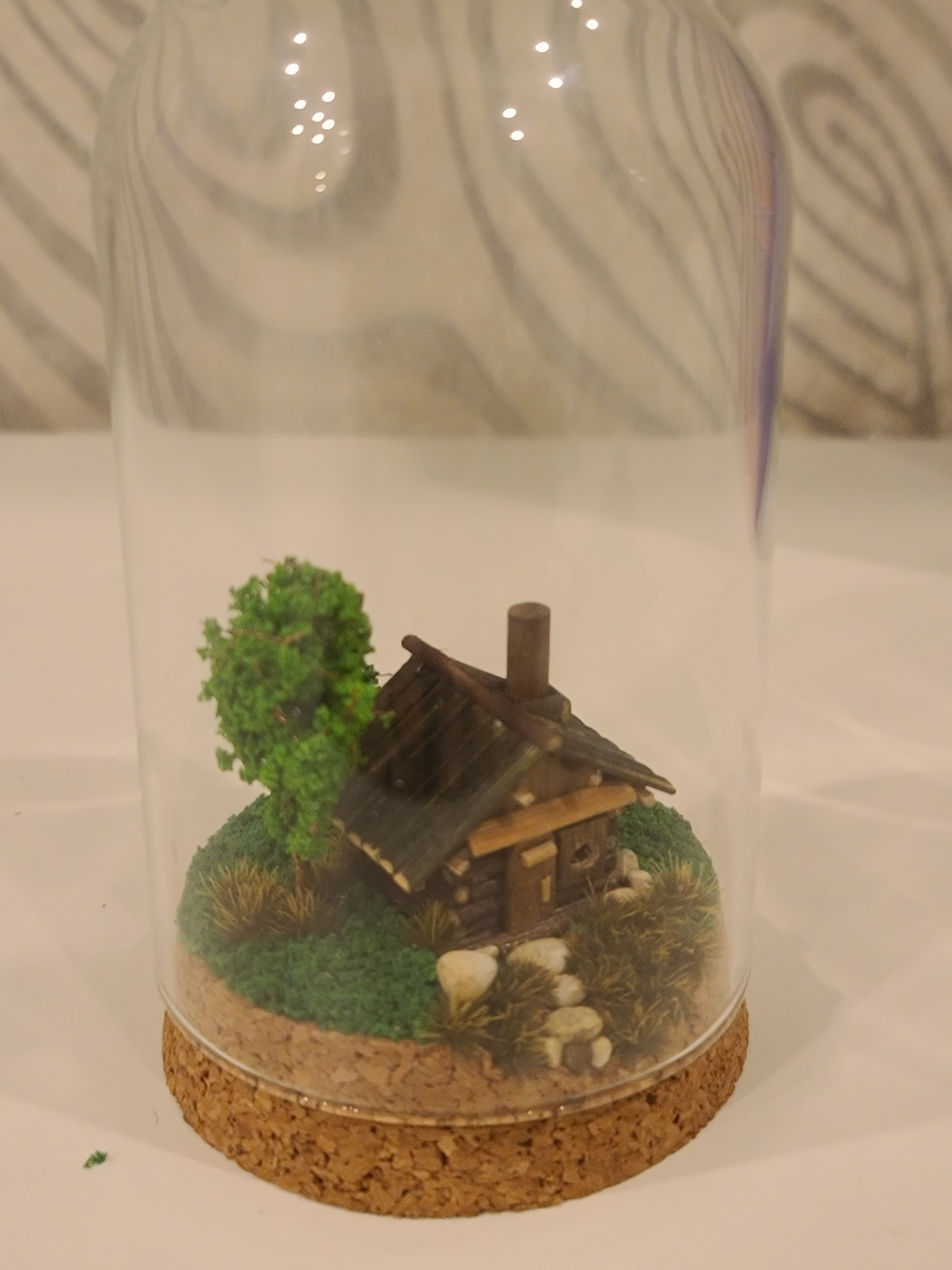 Вот такой небольшой домик в лесистой местности. Высота домика 25 мм. Деревья чуть повыше. Все засунул в клош. Вот думаю. Может снегом травку припорошить? Кстати. Вставил туда светодиод. Теперь может работать маленьким ночником)))