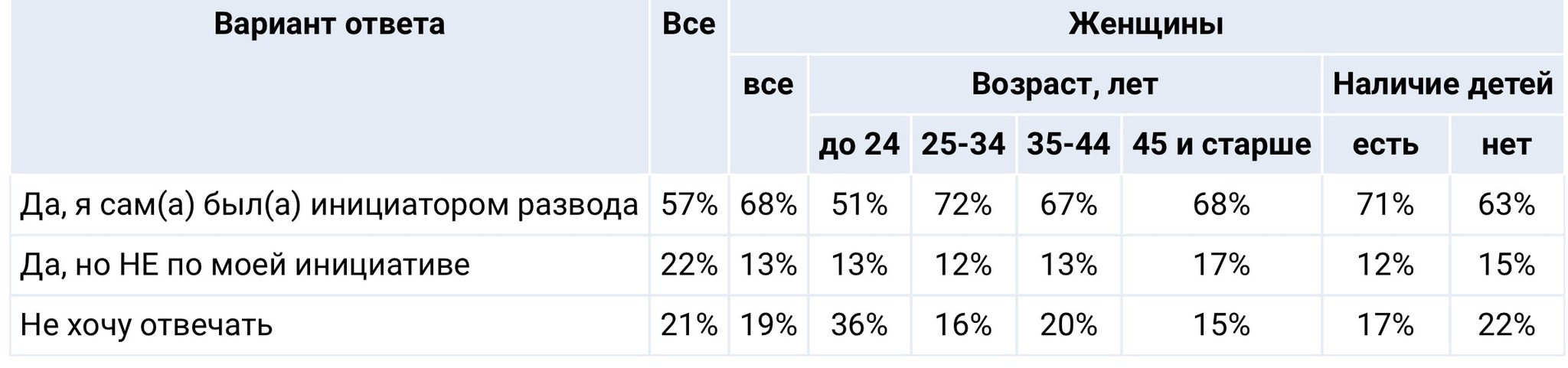 Когда утверждают «Бабы виноваты в разводе», я вижу следующее: «Женщина — собственность. Если она посмела уйти даже от самого плохого мужчины, то сама виновата в разводе. Она разрушила семью, потому что её дело — терпеть и быть „мудрой“».