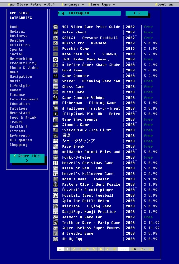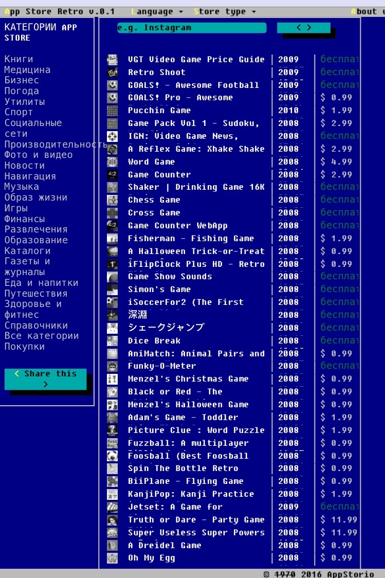 Я думаю многие помнят какими были pc без графического интерфейса, и этот сайт даёт возможность взглянуть какими бы были в те времена привычные нам всем AppStore и google play http://retro.andro.io/search/?q=retro%20game