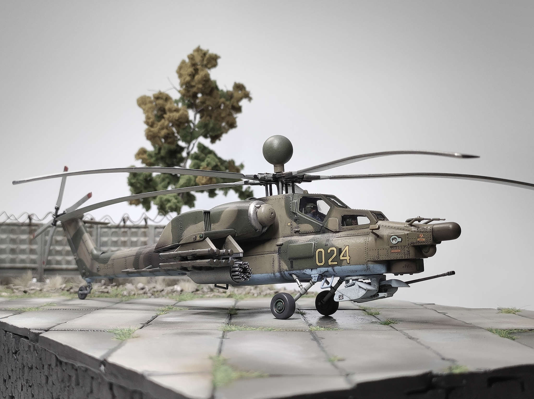 По самой модели - Ми-28НЭ от Звезды в 72 масштабе. Несложный набор, собрался быстро. Из косяков - пресс-формы явно устали, отливка со смещением половинок, зазоры толщиной в палец, копийности по нулям, заклёпки размером с голову младенца, детализация на уровне "ну оно там вроде как-то так было", и прочие радости классических наборов Звезды родом из девяностых годов. По плюсам - это красавец Ми-28, пусть даже в немного упрощённом виде, пока что безальтернативный в своём ценовом диапазоне. Звезда, я жду обновления линейки "двадцать восьмых"!