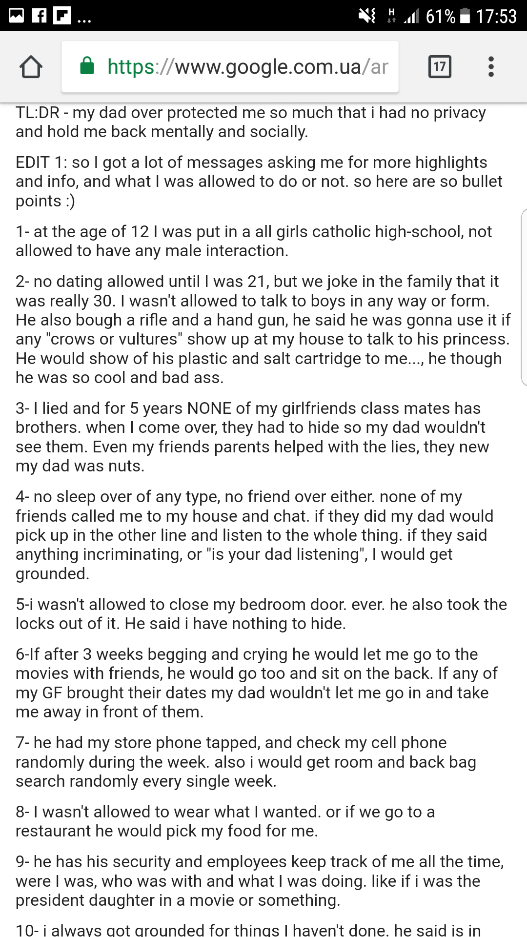 4. Никаких ночевок вне дома и никаких подруг с ночевкой у меня. Никто из моих друзей не звонил мне просто поболтать. Если такое случалось, отец брал вторую трубку и слушал весь разговор. Если вдруг он слышал что-то компроментирующее или кто-то спрашивал "твой папа подслушивает?", я была наказана.