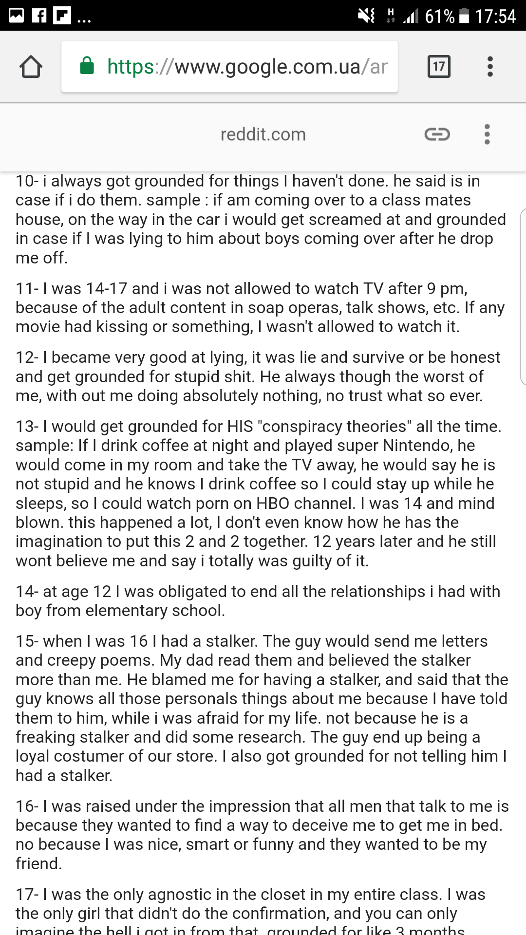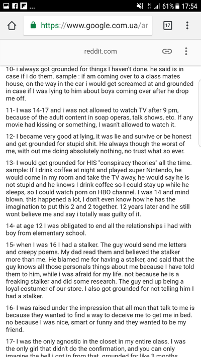 13. Меня постоянно наказывали за "теории заговора", существующие в его голове. Например, если я пила кофе на ночь и играла в super Nintendo, он заходил в мою комнату забрать телевизор, объясняя это тем, что он не дурак и знает, что я пила кофе, чтобы не уснуть и посмотреть порно по HBO, пока он спит. Мне было 14 и мой мозг взрывался. Такое случалось постоянно. Я даже не представляю, как подобное, вообще, приходило ему в голову. С тех пор прошло 12 лет, а он до сих пор уверен в своей правоте.