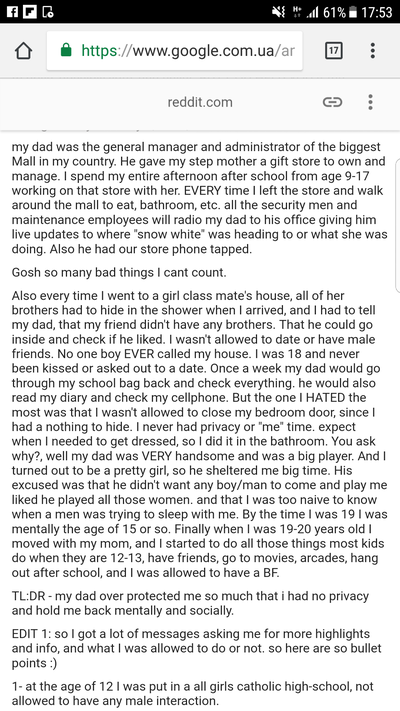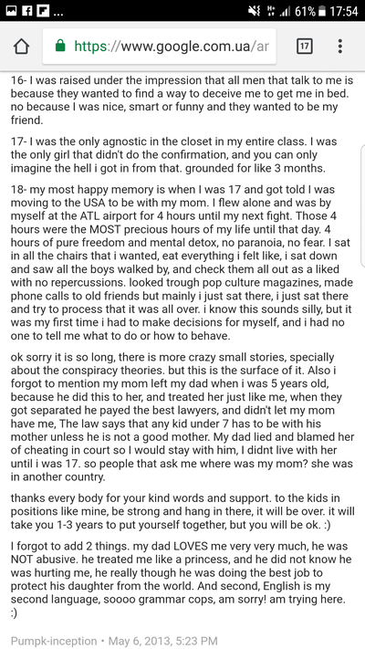 3. Я постоянно лгала, и все пять лет НИ У ОДНОЙ моей подруги не было братьев. Когда я приезжала к ним, братьям приходилось прятаться, чтобы мой отец их не увидел. Даже родители моих подруг помогали мне, зная, что мой папа сумасшедший.