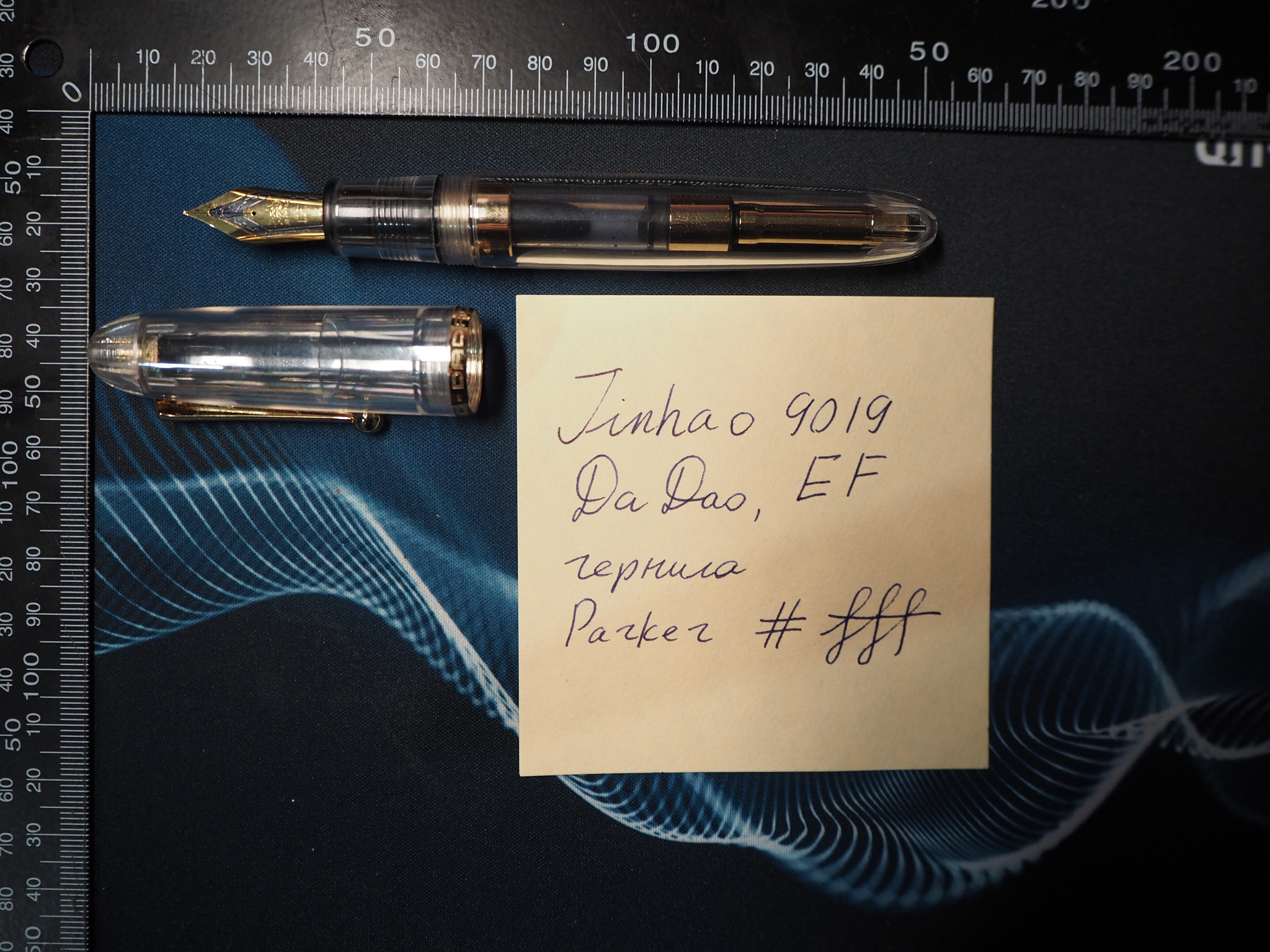 Jinhao 9019 DaDao (большой меч) эпичен, пафосен и удобен в письме (у меня не маленькая ладонь, девочкам с эльфийской ладошкой и детям вряд ли подойдёт). Но имеет круглую грип секцию и колпачок на резьбе, отсюда и его судьба - длинные запилы на страницу или две, например конспекты, журналы и прочие рукописи. Пишет гладко и ровно, имеет какой то безразмерный конвертер на борту, большое перо, на котором написано EF, но это нифига не EF а что то ближе к М(midium).