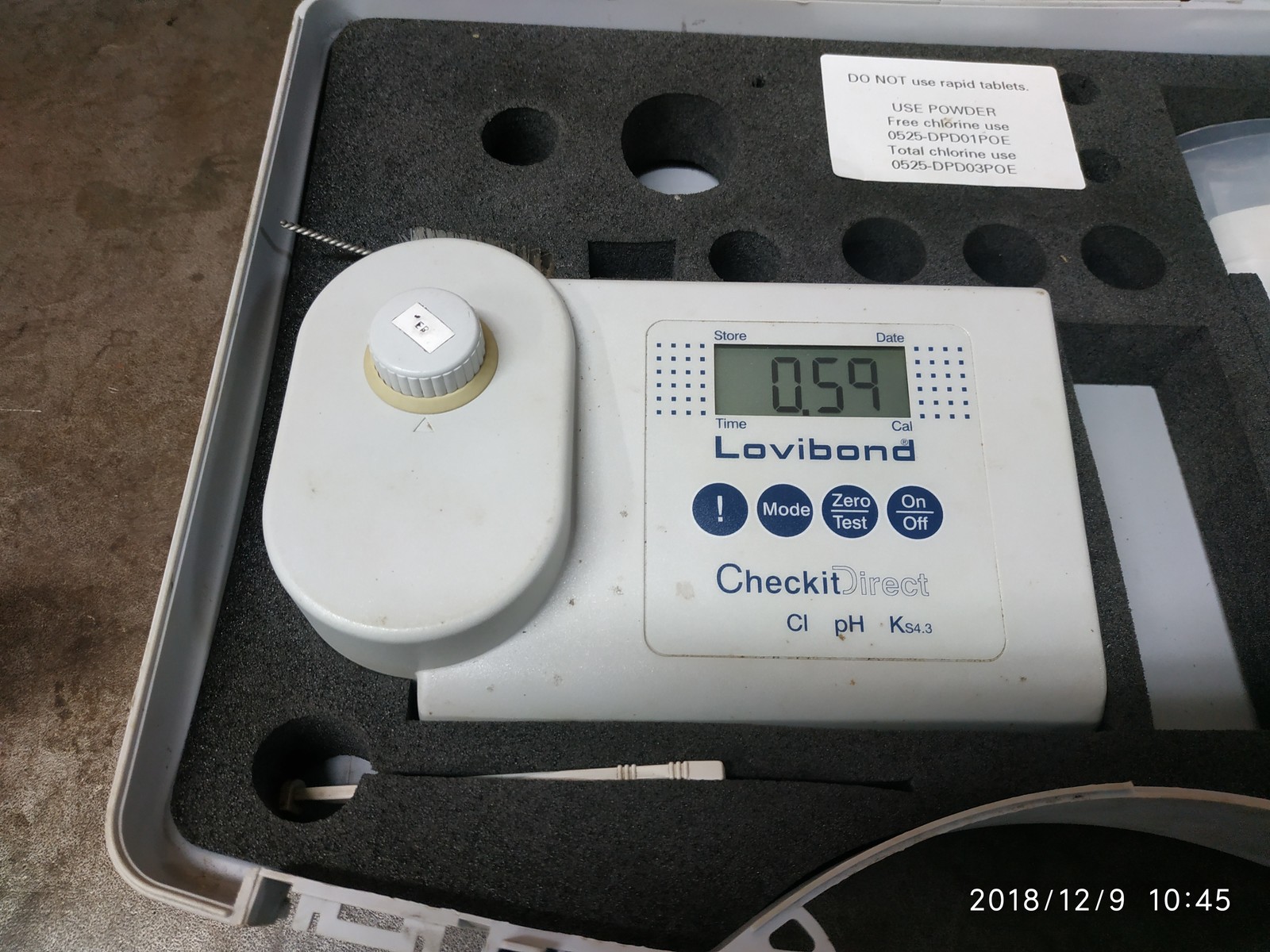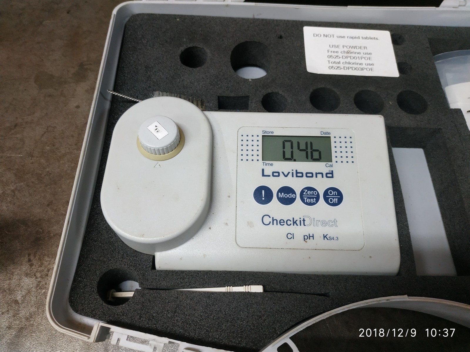 Тест состоит из трёх этапов. Сначала калибруется измеряющий прибор. Надо только установить пизырёк с десятью миллилитрами воды для анализа и тыкнуть в кнопку Zero/Test. После этого в флякончик подмешивается порошок, определяющий количество свободного хлора в пробе, а заодно окрашивающий его в розовый цвет. И опять жмякаешь кнопку теста.