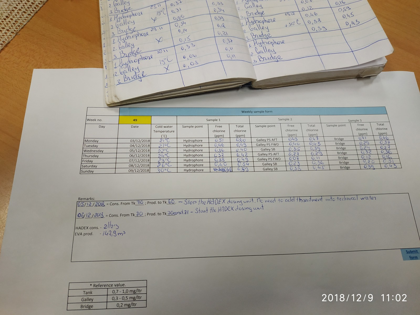 В конце рабочего дня их надо занести в лист проверок, который к концу недели сканируется и копии отсылаются в лабораторию производителя и офис компании, а так же сохраняются в системе планирования судна.