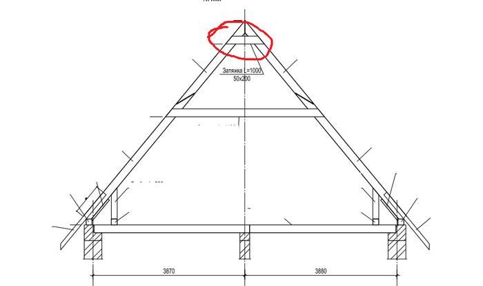 При устройстве стропильного каркаса крыши не установлены стропильные затяжки на каждую стропильную ногу, которые образуют жесткий треугольник и предотвращают сдвиги стропильных ног с наружных стен дома. Не выполнены требования п. 8.2.1.1, п. 8.2.2.1, п. 8.2.2.5, п. 8.2.2.6 СП 31-105-2002 «Проектирование и строительство энергоэффективных одноквартирных жилых домов с деревянным каркасом». Затяжки можно соединить и на гвозди согласно п. 8.2.2 СП 31-105-2002. Но, согласно нормативов СП 64.13330.2017 «Деревянные конструкции» и СП 20.13330.2016 «Нагрузки и воздействия» усилие распора крыши не компенсируется соединениями на гвозди в указанном количестве или в нашем случае 2 шт и загнутыми ненадлежащим образом. В данном случае рекомендуется применить конструкционный крепеж (шпильки, болты), произведя расчеты по формулам вышеизложенных СП и добавить необходимое количество крепежа или правильно загнутых гвоздей длинной более 150 мм и толщиной 5 мм. Затяжки (ригели) у вас смонтированы через одну стропильную ногу. Рекомендую поставить на каждую и усилить содинением из шпильки диаметром не менее 14 мм в количестве 2 шт в каждом месте соединения. Т.е. 2 шпильки с одной стороны затяжки , 2 шпильки с другой стороны затяжки. Так же рекомендую установить верхние ригели на шпильки диаметром не менее 14 мм в количестве 1 шт в каждом месте соединения как указано на рисунке ниже. Это придаст дополнительную прочность конструкции: