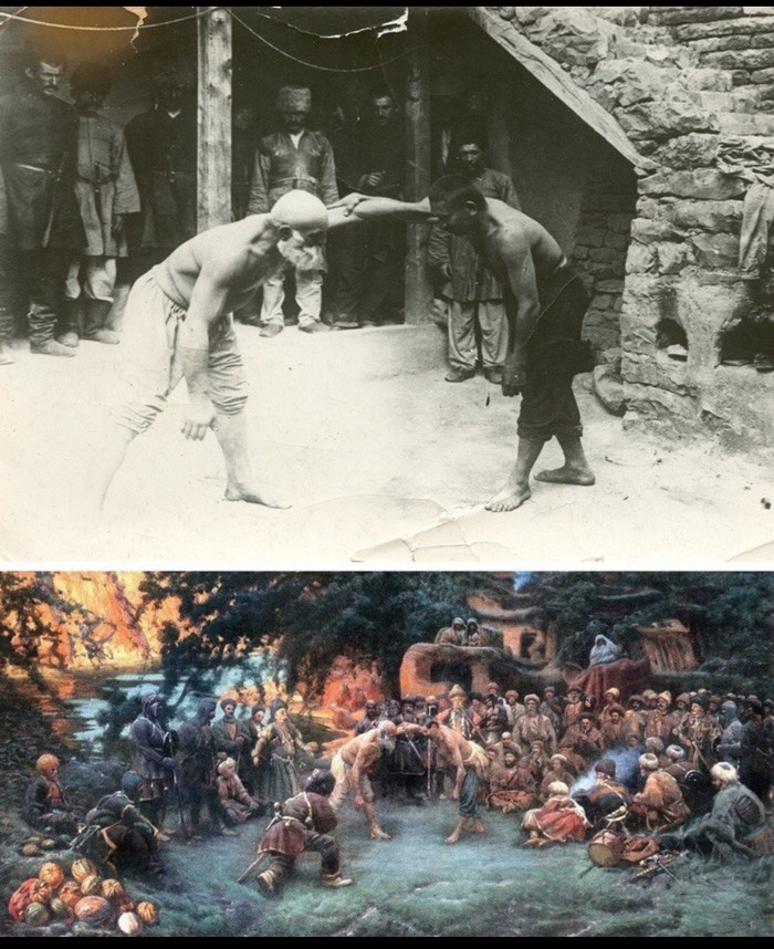 3. Обучение борьбе в Дагестане. По мотивам этой фотографии грузинский художник Георгий Габашидзе (1862-1936)написал картину "Борьба"